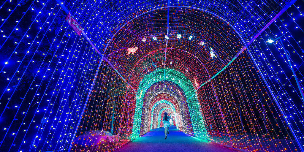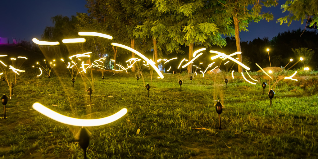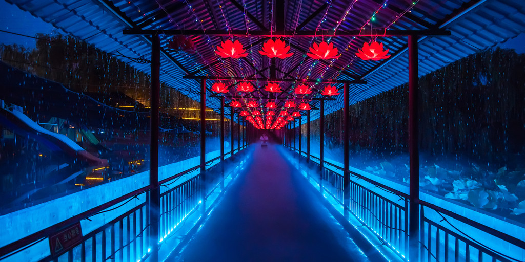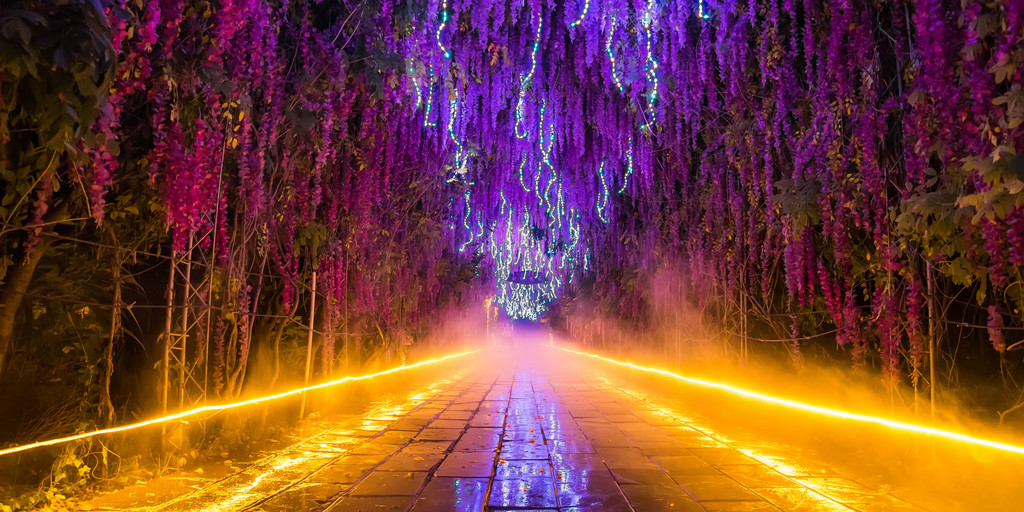 而入了夜,这里的精彩才真正开始。此时此刻,这里“荷塘月色消夏游”活动正在精彩上演。你可以看到各种各样的好拍的炫酷灯光装置与仙气十足的紫藤长廊,有好看的荷塘月色发光装置与草丛里的亲子互动设施。