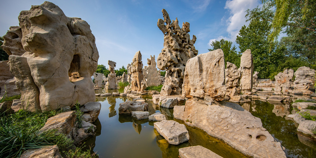 在水上石林景区,可以一览奇石“瘦、漏、透、皱、奇、丑、怪”的特色,亭台楼阁廊榭舫,足不出户,在北方也能感受到南方园林的气质。
