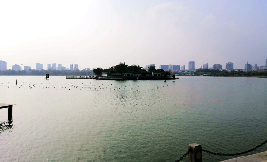 湖中岛屿众多,水鸟翱翔,名人岛、湖心岛、百花岛、月亮岛、南关岛、葫芦岛、状元岛等如众星拱月,我来到了名人岛,岛中的集萃阁被铁栏杆围着,询问在岛上的一位女钓者,她说集萃阁被锁了好几年,景区是怕游客爬上去而出安全事故。