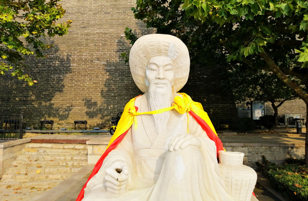 一座古装人物雕像端坐于角楼旁,不知何方名士,雕像周围未见介绍牌。