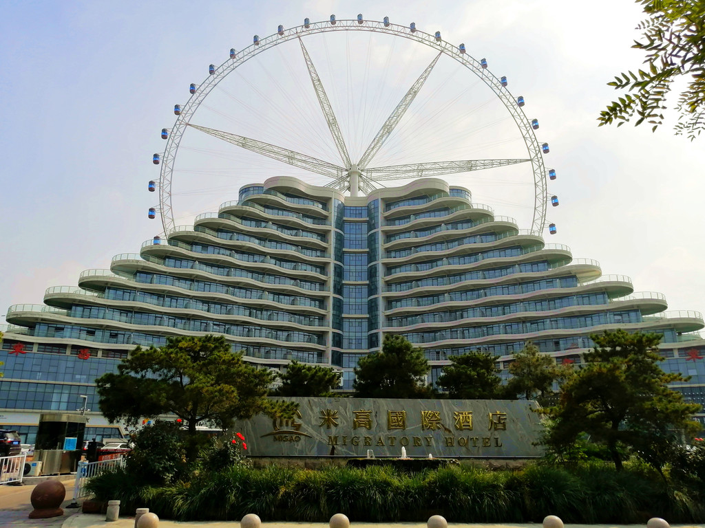 走到东昌湖南岸时,一座流线形的高大建筑吸引了我,是米高国际酒店,蓝色是酒店的主色调。酒店的两栋建筑中间架了一个巨大的摩天轮,这个“水城之眼”为亚洲三大摩天轮之一,在蓝天丽日下显得很壮观。我不理解为什么摩天轮要架在两栋建筑中间,把酒店劈为两半。
