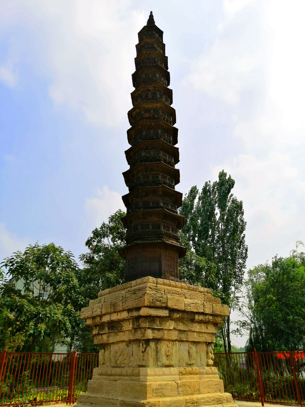 孤零零的瘦高个子被铁栏围着,我将手机穿过窄窄的栏杆,拍下了它的寂寞身影。这座列为中国六大古铁塔之一的铁塔来自宋代,也有人说建于辽金时期,塔高十三层,原本在护国隆兴寺内的东南角,后来修路,把它从寺里分离出来了。