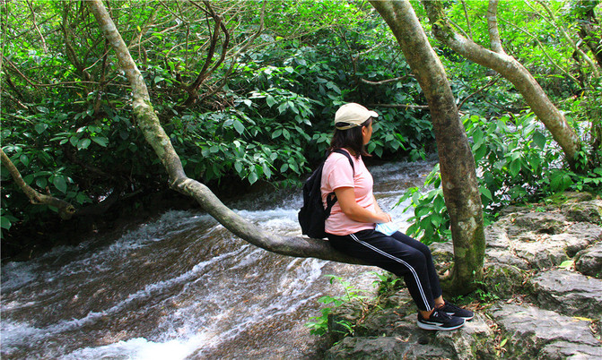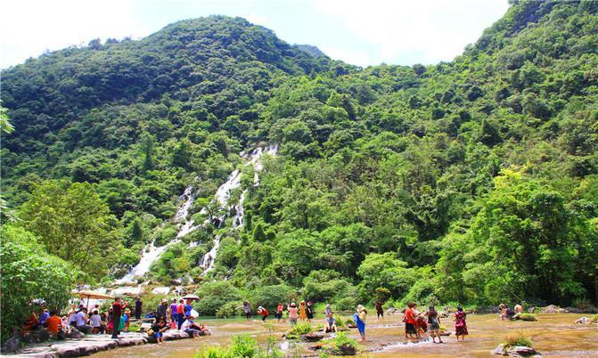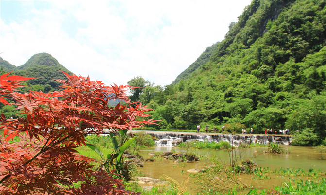 沿河谷伴梯级瀑布而上,一路但见高山流水、绿树红花,但闻泉鸣瀑响、鸟啾虫吟,美不胜收。