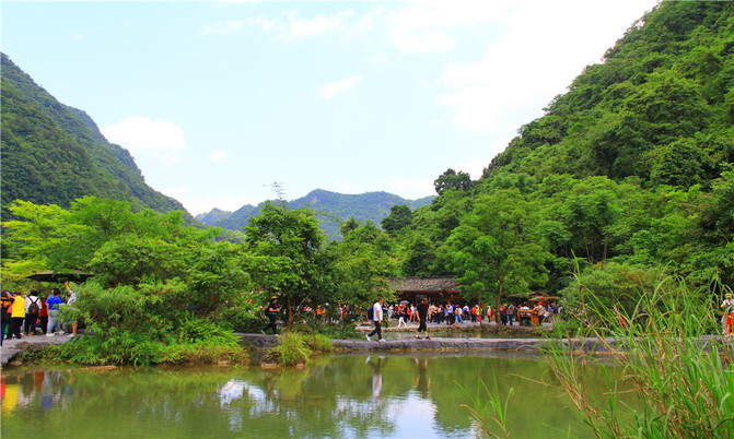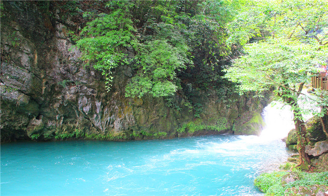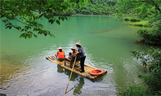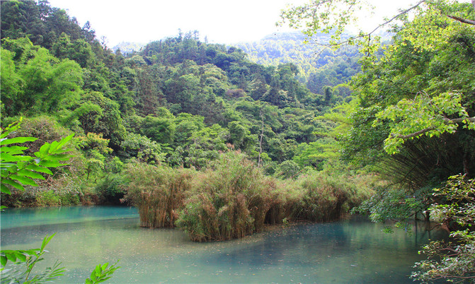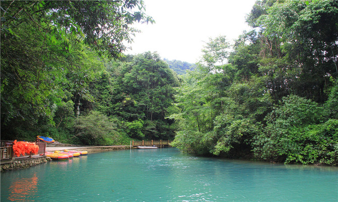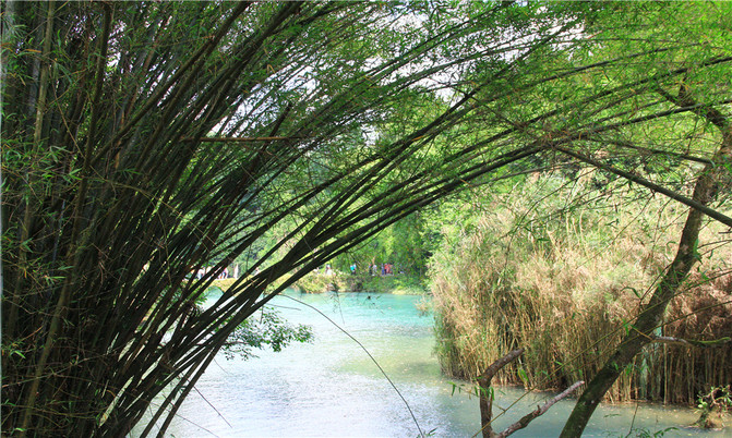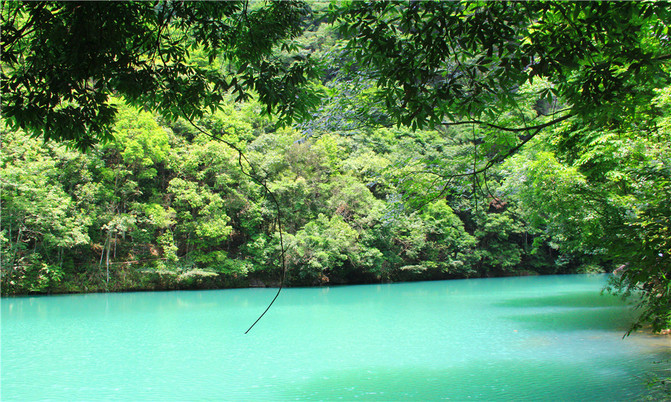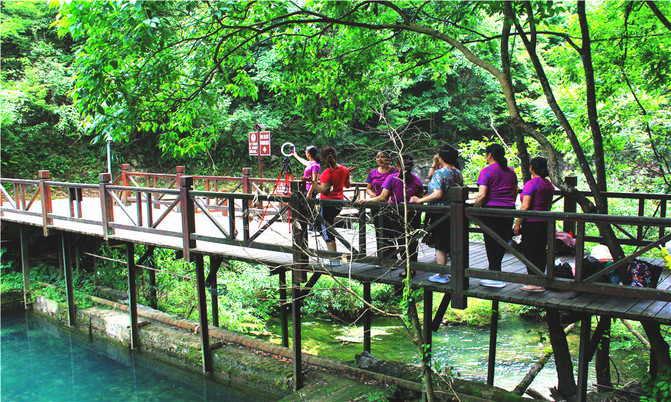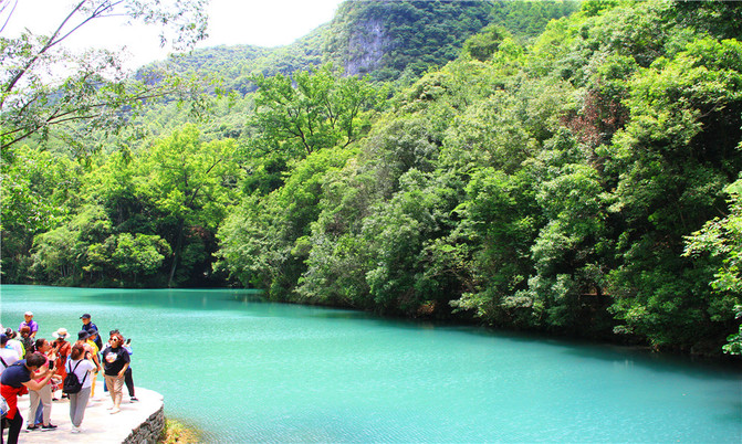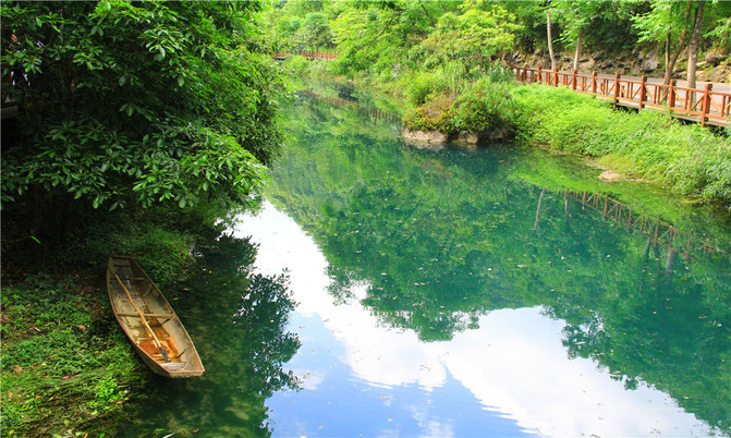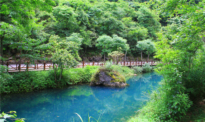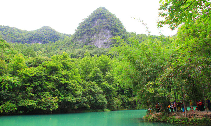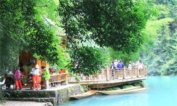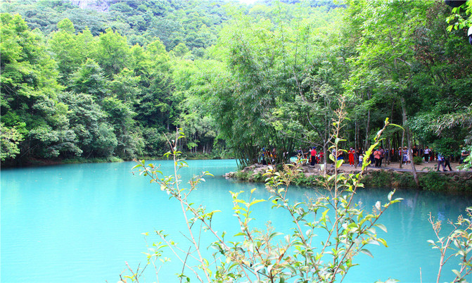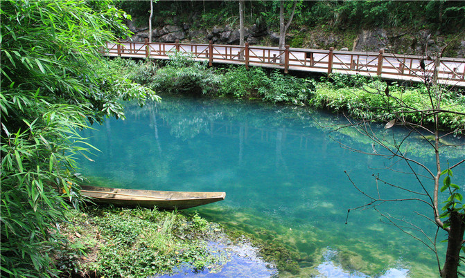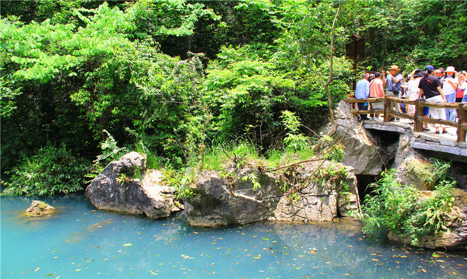 卧龙潭犹如地底深渊,水面湛蓝清澈,岸上的峰峦、绿树、竹林倒映潭中,色彩斑斓绚丽,置身其间,宛若画中游。