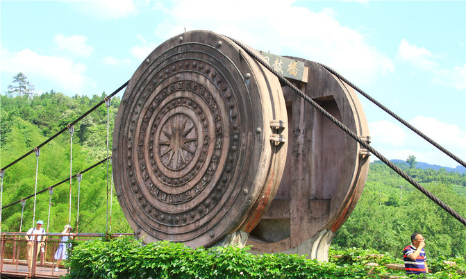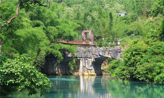 小七孔铜鼓桥位于小七孔景区东大门处,横跨樟江河,始建于1993年,重建于2001年(2001年荔波境内遭遇特大洪水将原铜鼓桥冲毁)。铜鼓桥长126米,净跨60米,宽2.4米,高25米,桥身两端采用瑶山铜鼓造型,故称此桥为铜鼓桥。