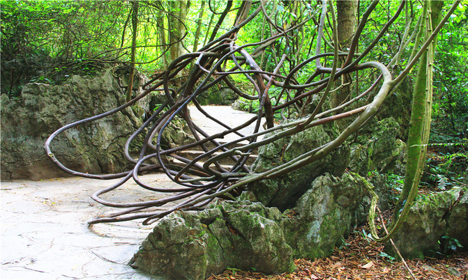 小七孔醉林满眼都是藤萝枝蔓,分不清哪是树,哪是藤,也不知是藤缠树,还是树缠藤,层层叠叠的树枝从树梢一直垂落到地下,一株株披藤挂萝的树木就像喝醉了酒的老汉一样,歪歪斜斜,站立不稳。