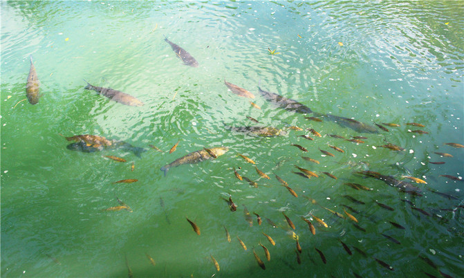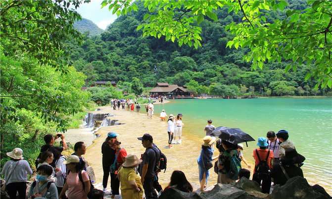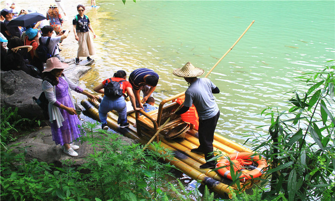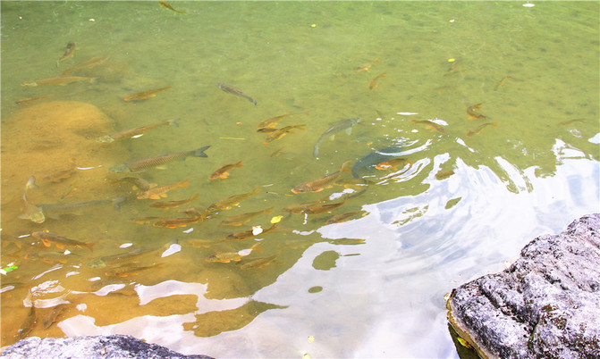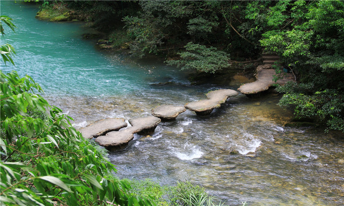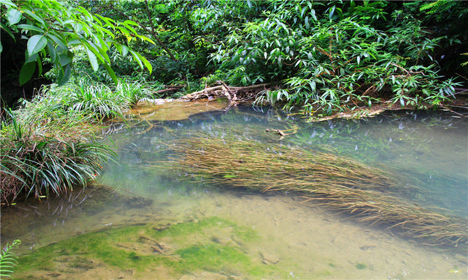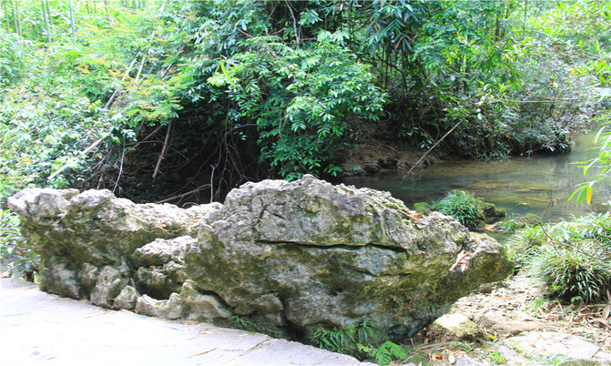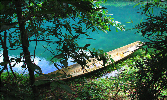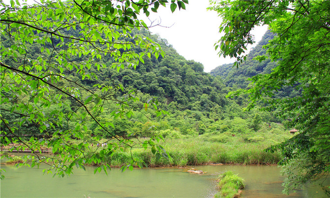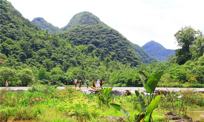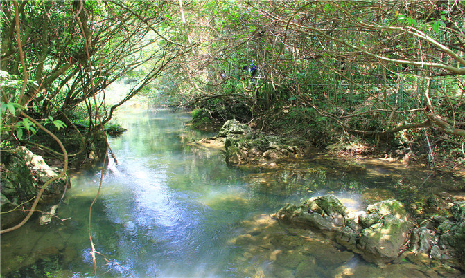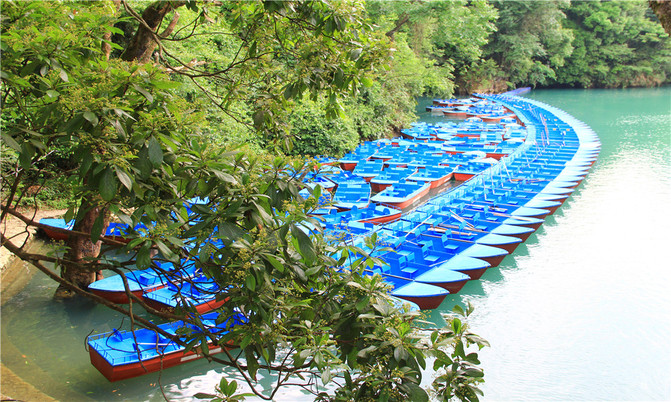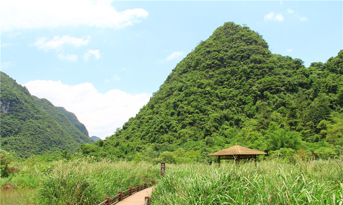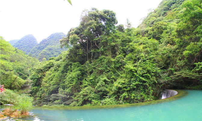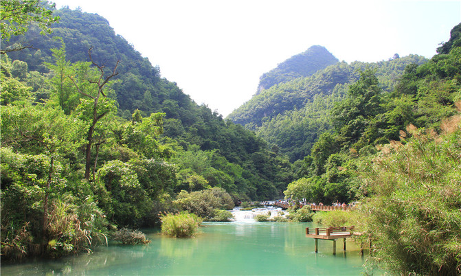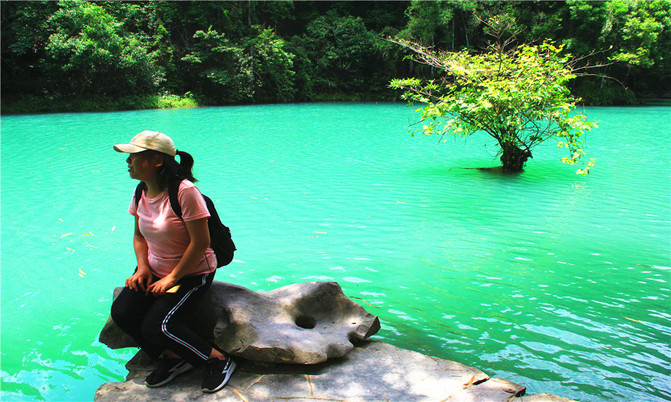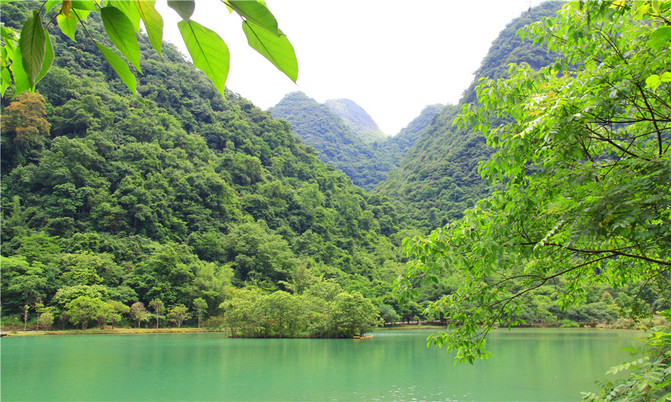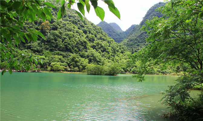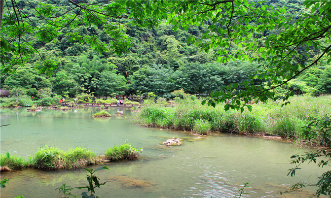 沿着翠谷瀑布旁不显眼的走廊走到一片湿地,你会发现这里却是被隐藏的世外桃源,山清水秀,孤峰一座紧接一座,湖面水平如镜,青峰倒影,能清晰看到湖底的沙石,美不胜收。