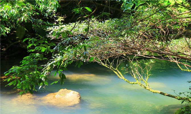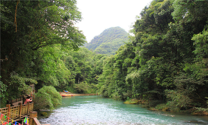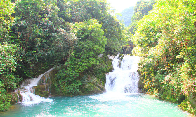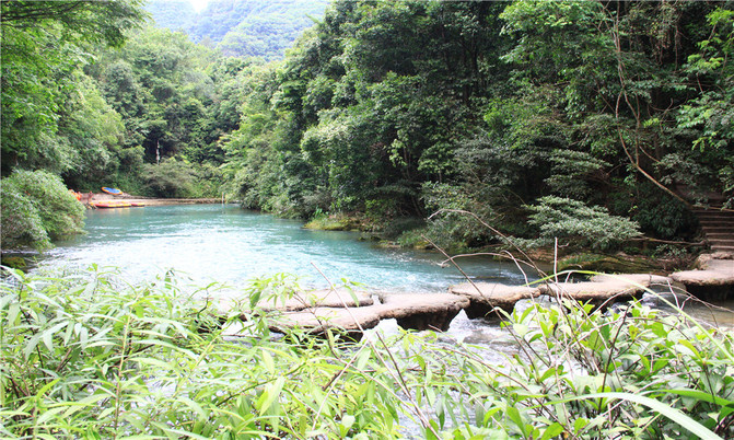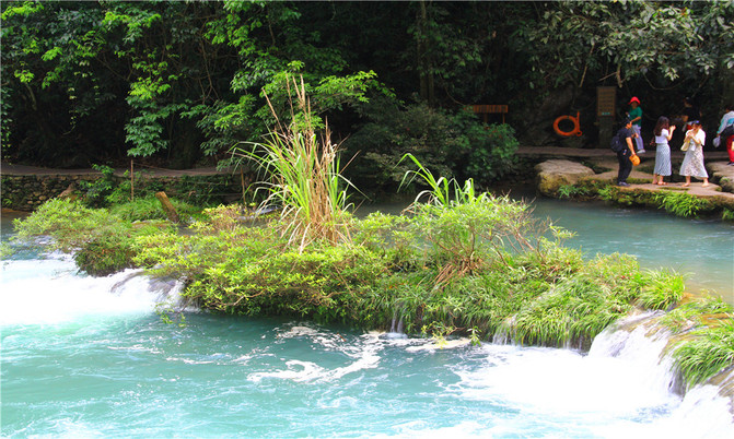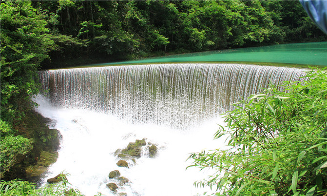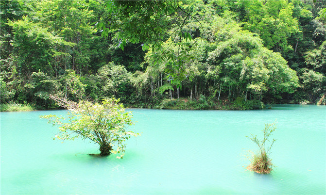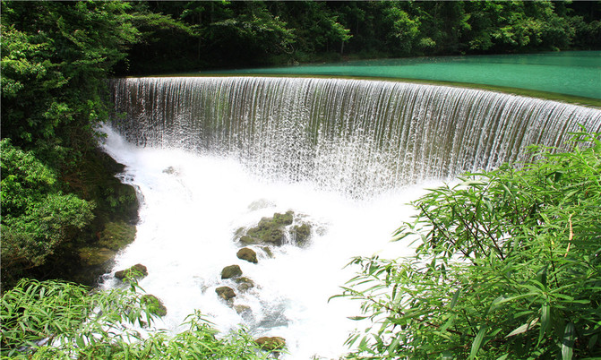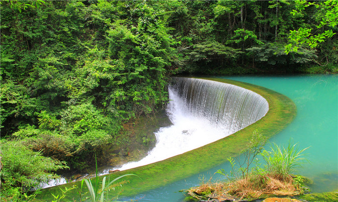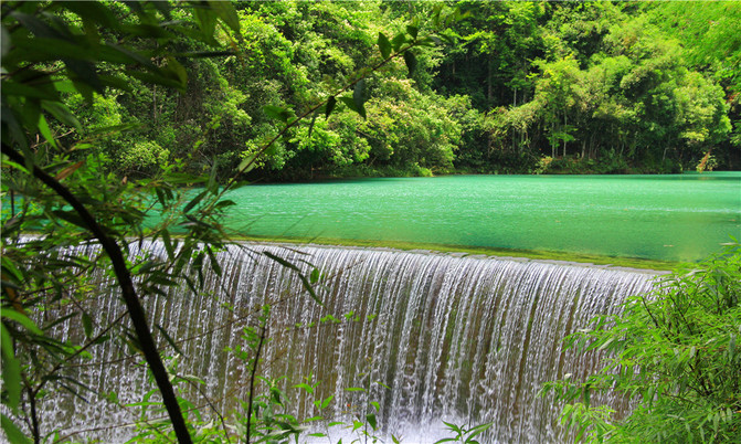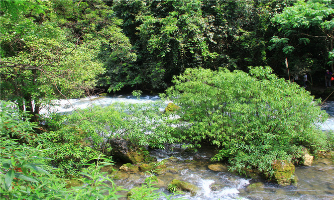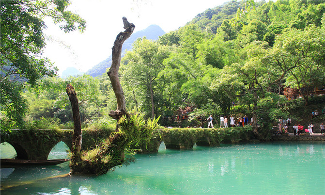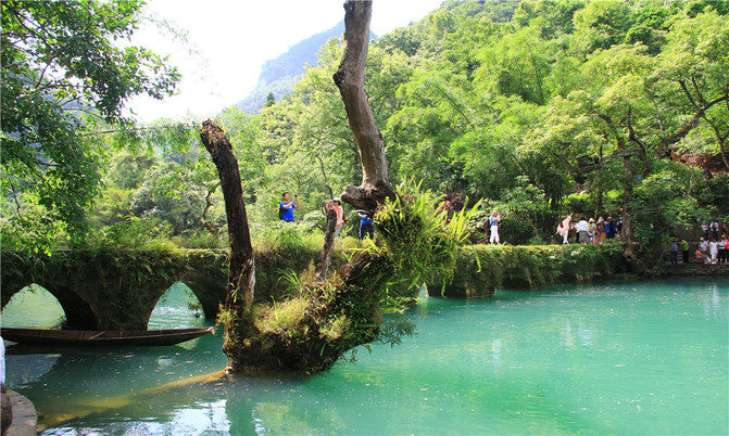 荔波小七孔风景区在宽仅1公里、长12公里的狭长幽谷里,集洞、林、湖、瀑、石、水多种景观于一体,玲珑秀丽,有超级盆景的美誉。