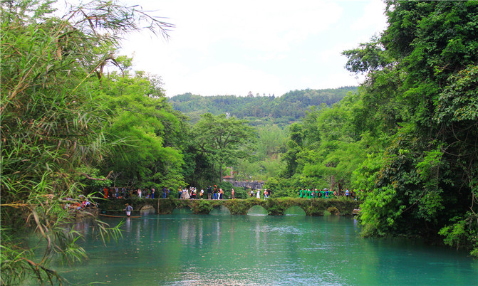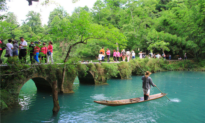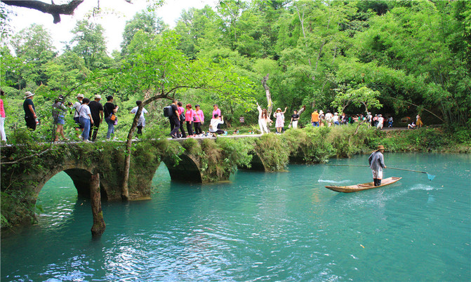 小七孔古桥景区之名由桥而得。这是一座小巧玲珑的七孔古石桥,桥长25米,桥面宽4米,拱高4米,建于清道光15(1836)年,昔为沟通荔波至广西的重要桥梁。