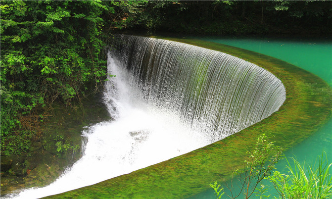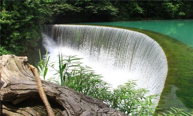 卧龙潭源源不断的绿水从坝上滚下,形成规模庞大的特色瀑布,瀑布如丝,月牙的形状犹如一把仙人梳。
