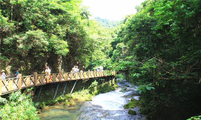 沿着木栈道前往卧龙潭风景区