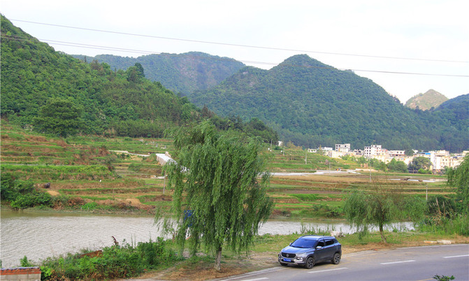 沿途一路的山山水水,山水相连,连绵起伏。山腰盘旋的那曲折蜿蜒的公路如缕缕飘带缠绕在那青山之中,成为一道独特亮丽的风景。朦胧的远山,笼罩着一层轻纱,影影绰绰,在飘渺的云烟中忽远忽近,若即若离,看到此场景,只想感慨一句:“此景只应天上有,人间能得几回闻