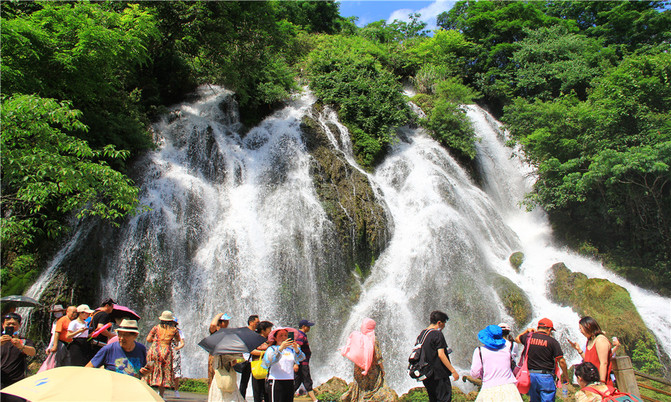 层层叠叠的瀑布,淙淙哗哗倾泻而下,或倾珠撒玉,推雪拥云,或如匹练飘逸,似银河泻地,形态各异,气象万千。