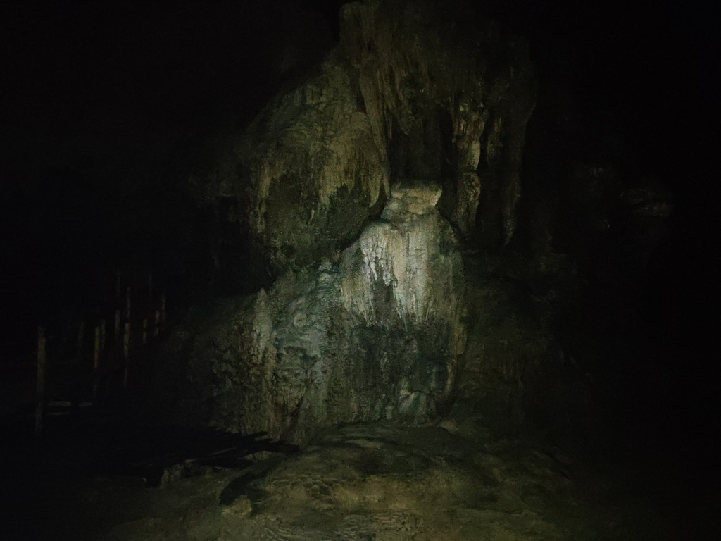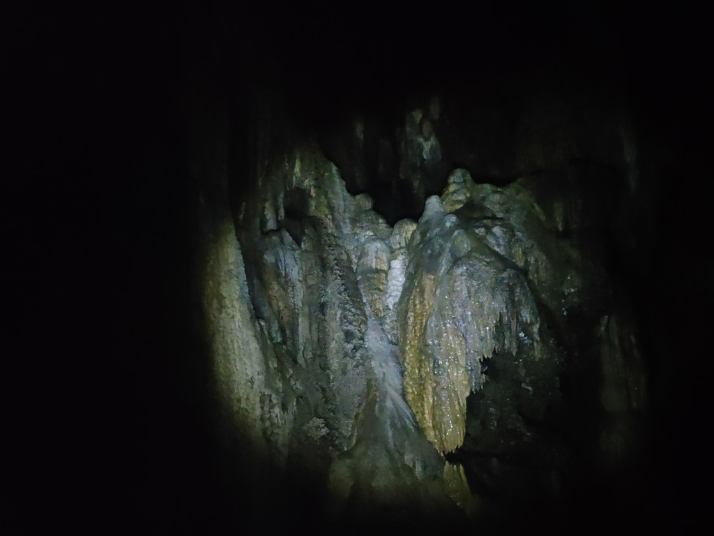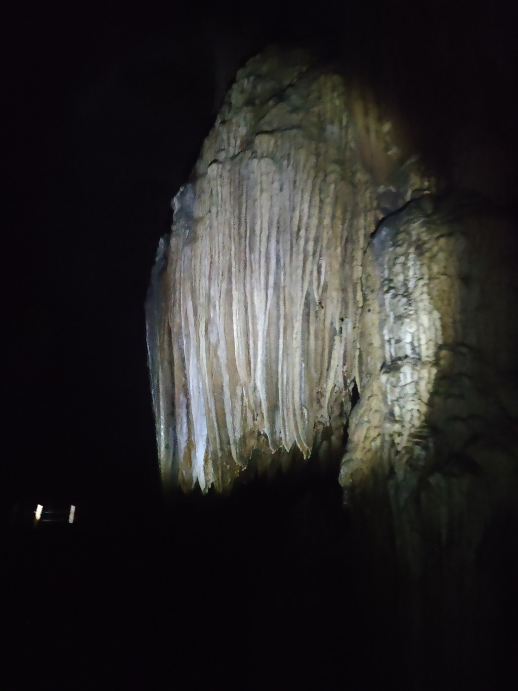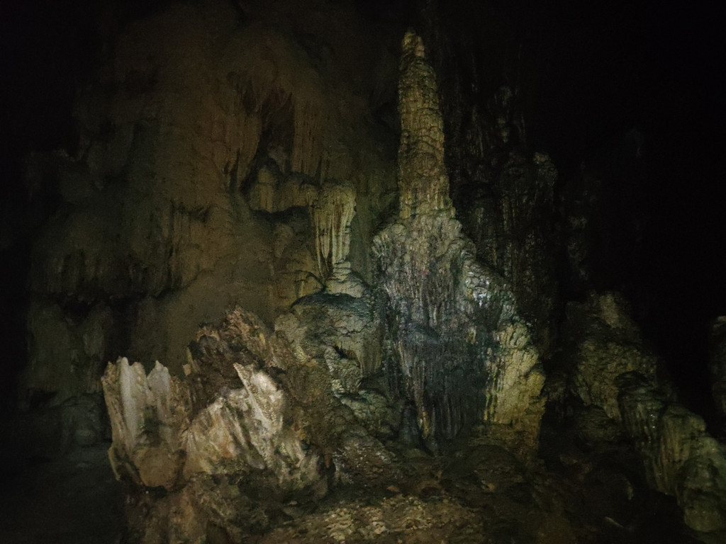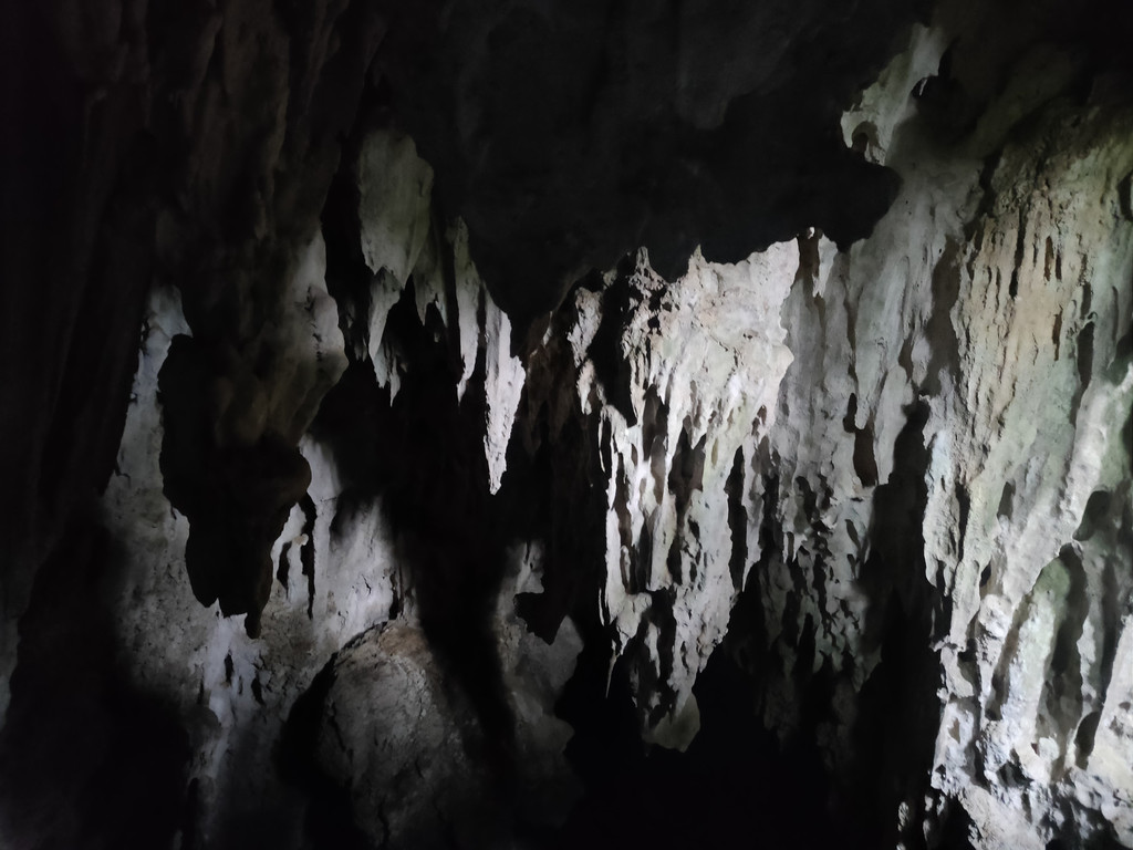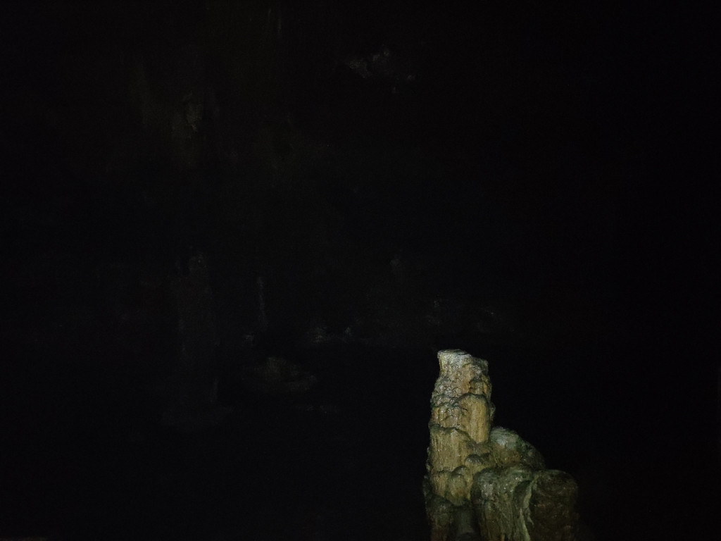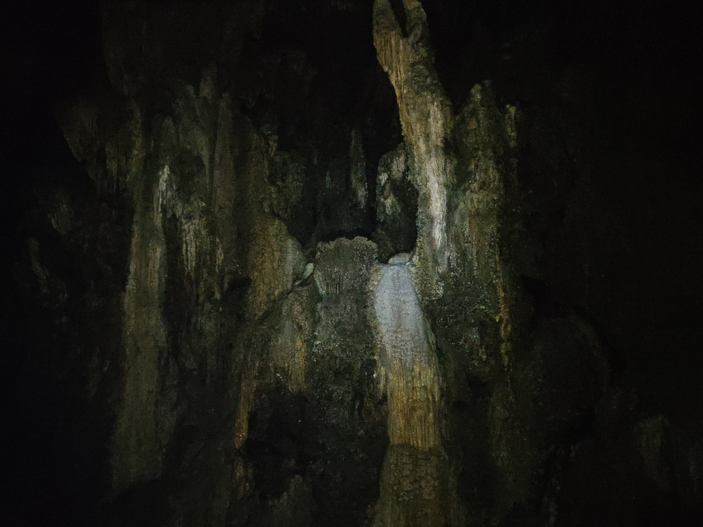 走进洞口,我们才知道为什么需要用探照灯和手电,因为里面完全没有任何灯光,全封闭的喀斯特溶洞,连天窗都没有一个,所以别想着漏一丝光线下来。