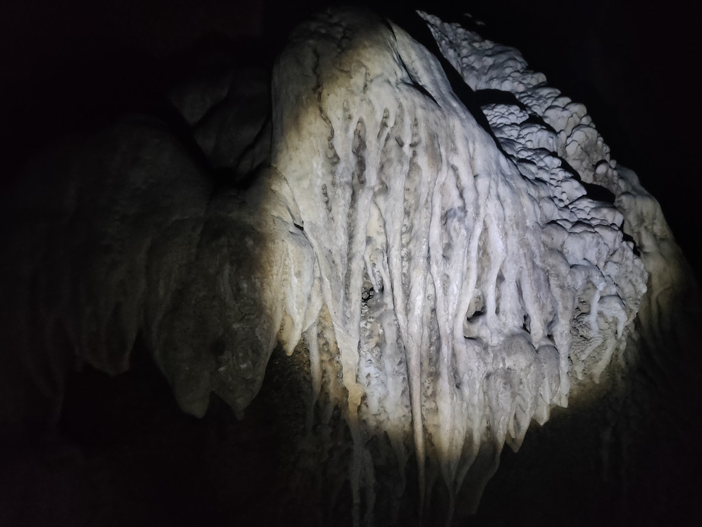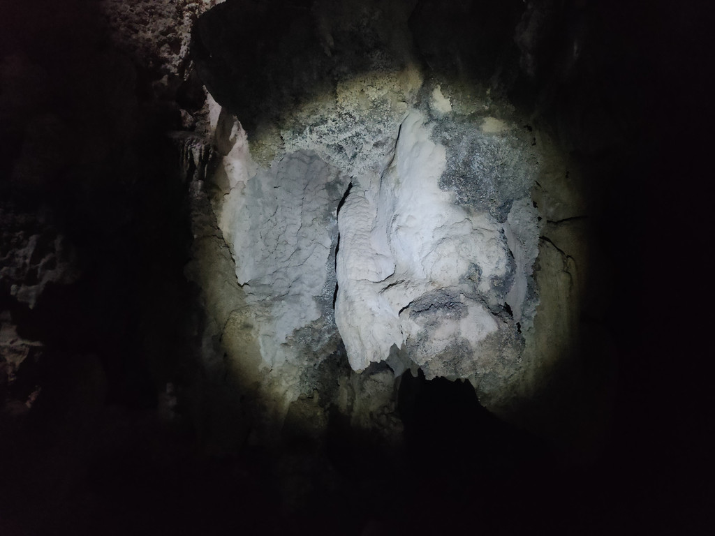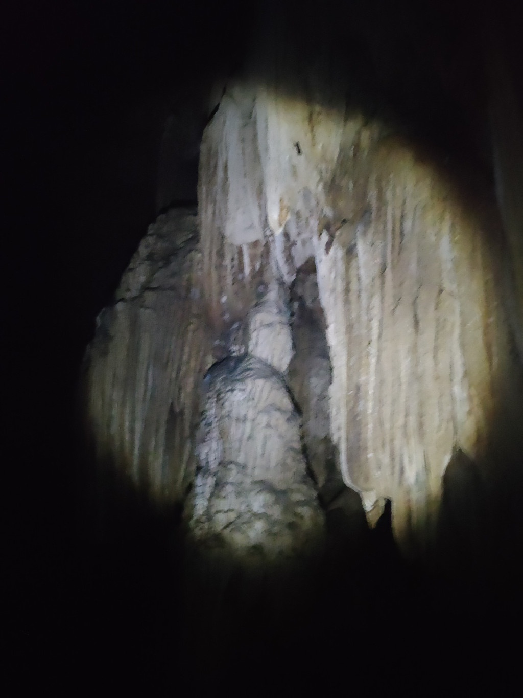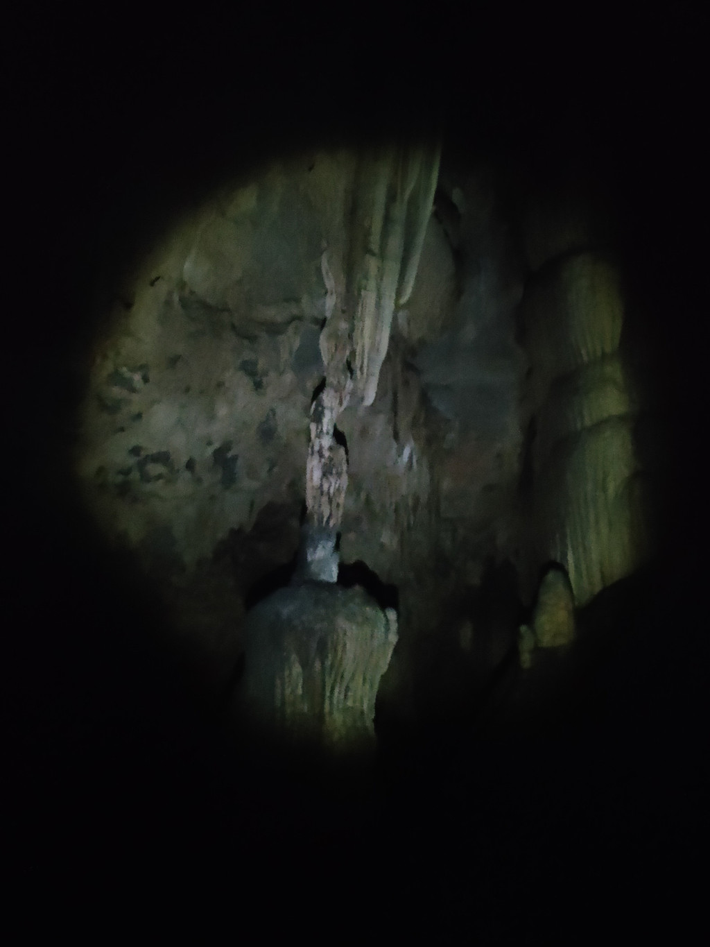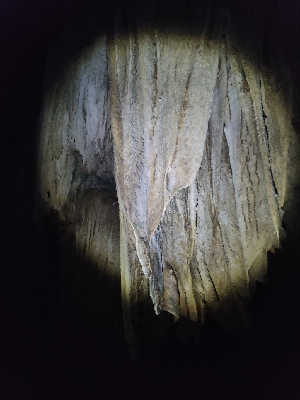 走进洞口,我们才知道为什么需要用探照灯和手电,因为里面完全没有任何灯光,全封闭的喀斯特溶洞,连天窗都没有一个,所以别想着漏一丝光线下来。