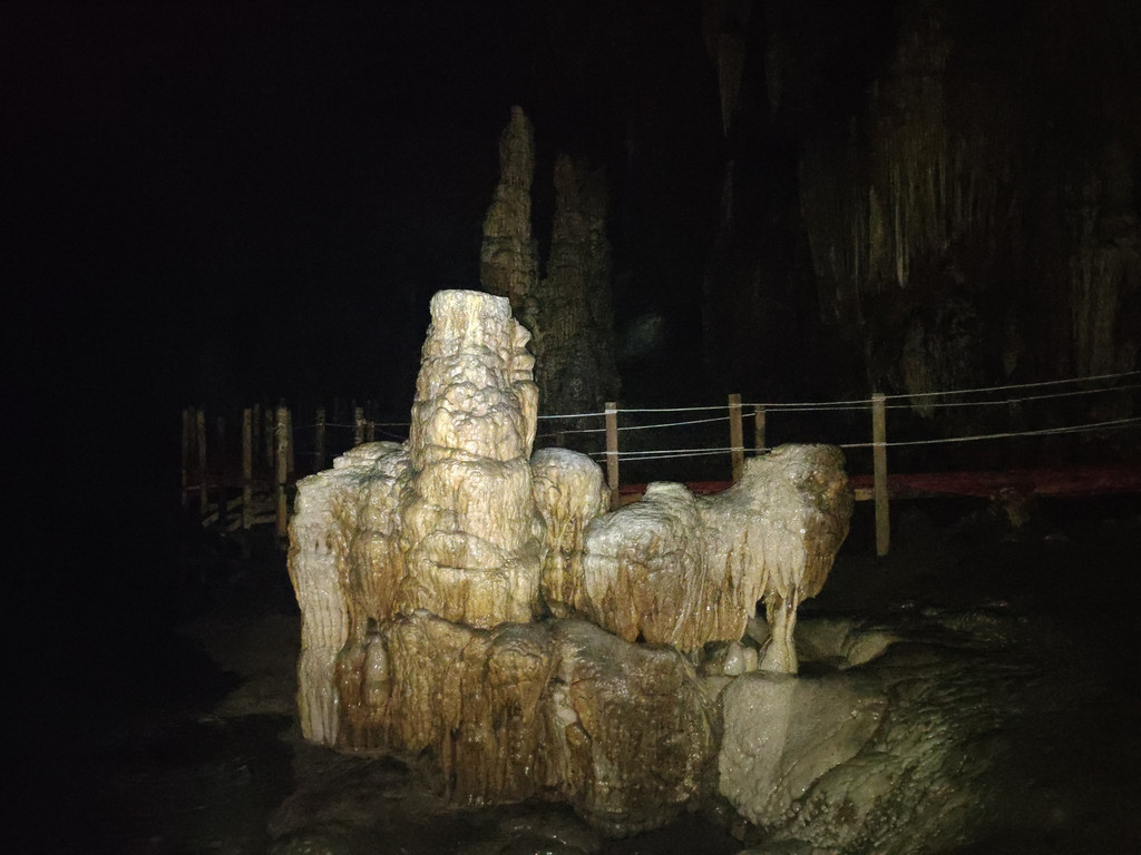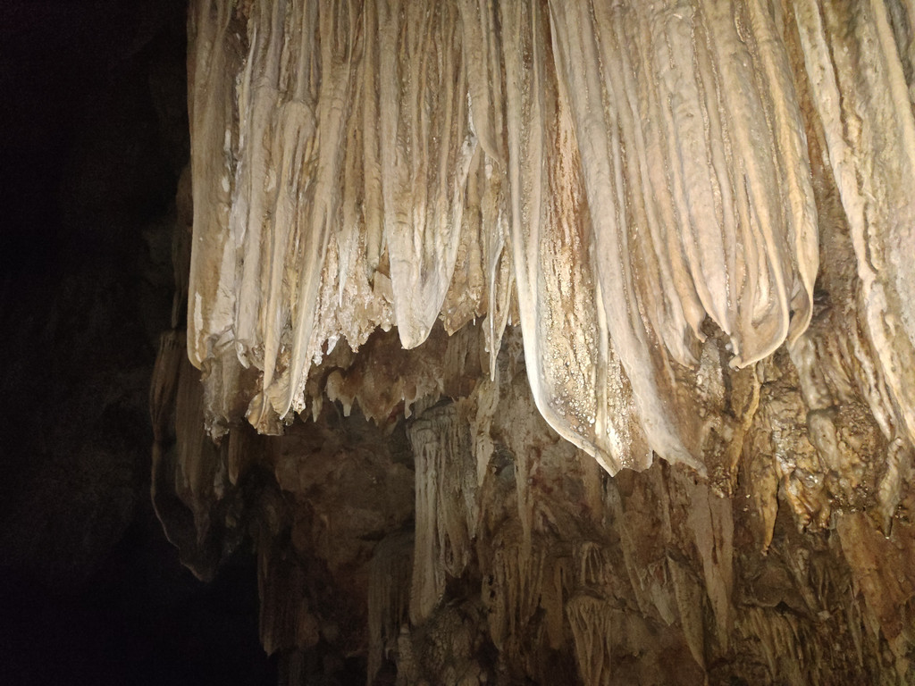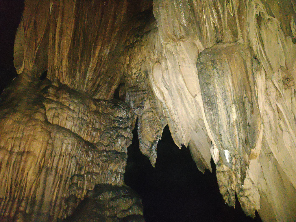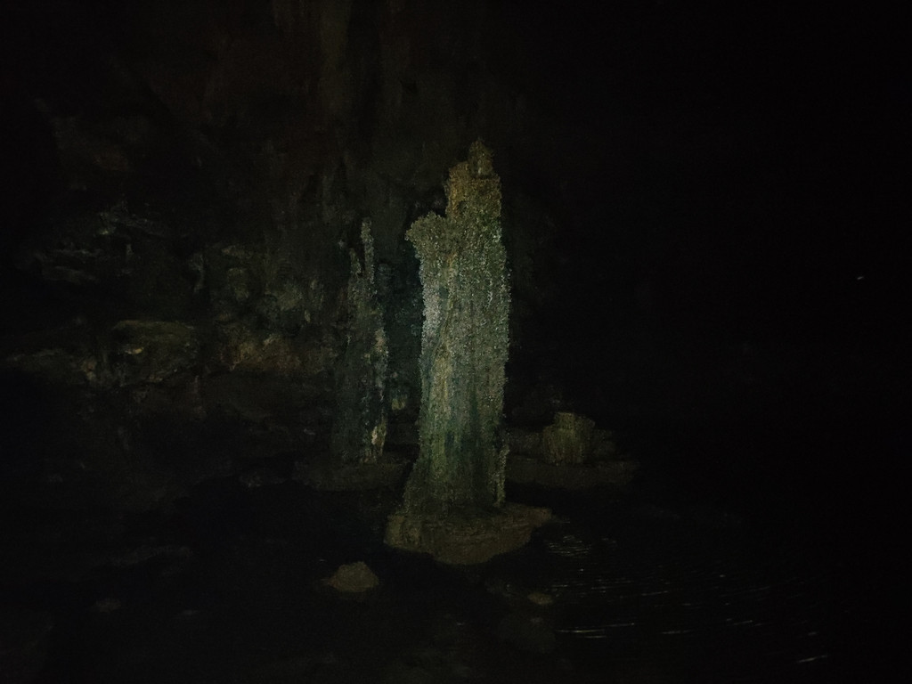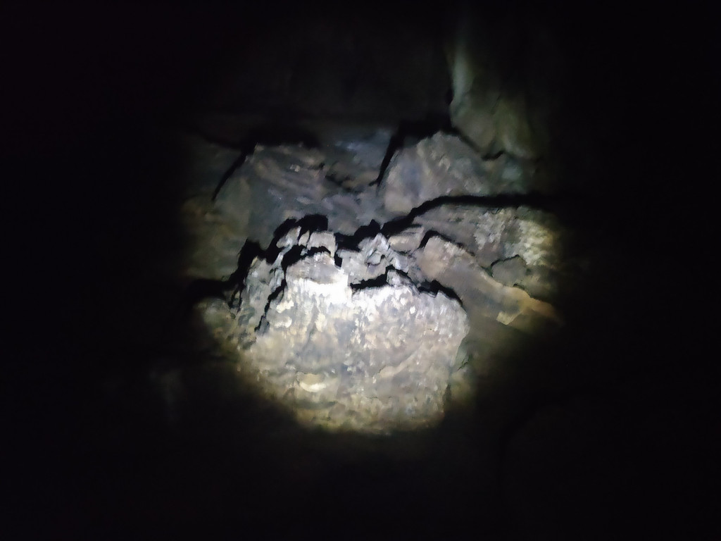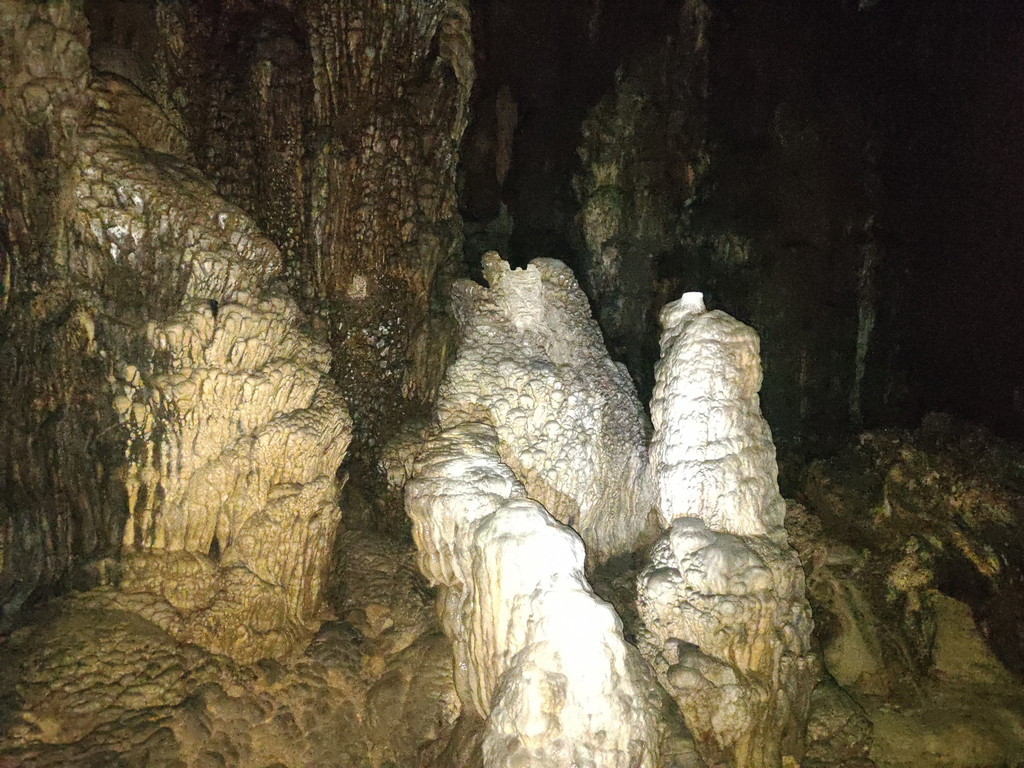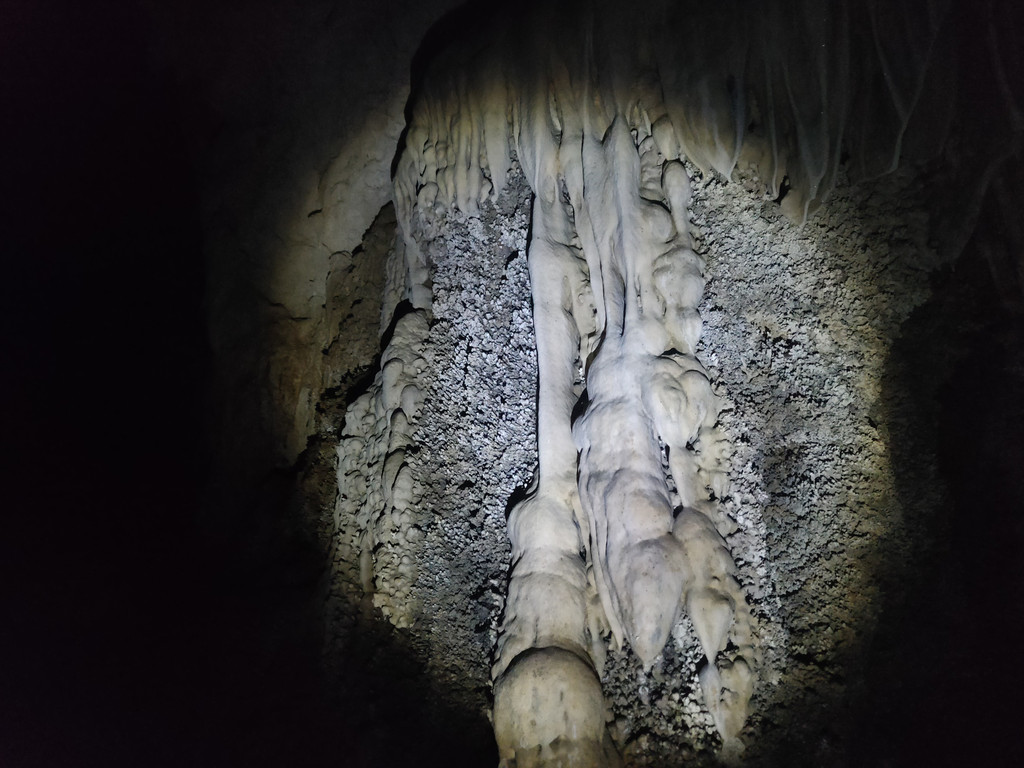 走进洞口,我们才知道为什么需要用探照灯和手电,因为里面完全没有任何灯光,全封闭的喀斯特溶洞,连天窗都没有一个,所以别想着漏一丝光线下来。