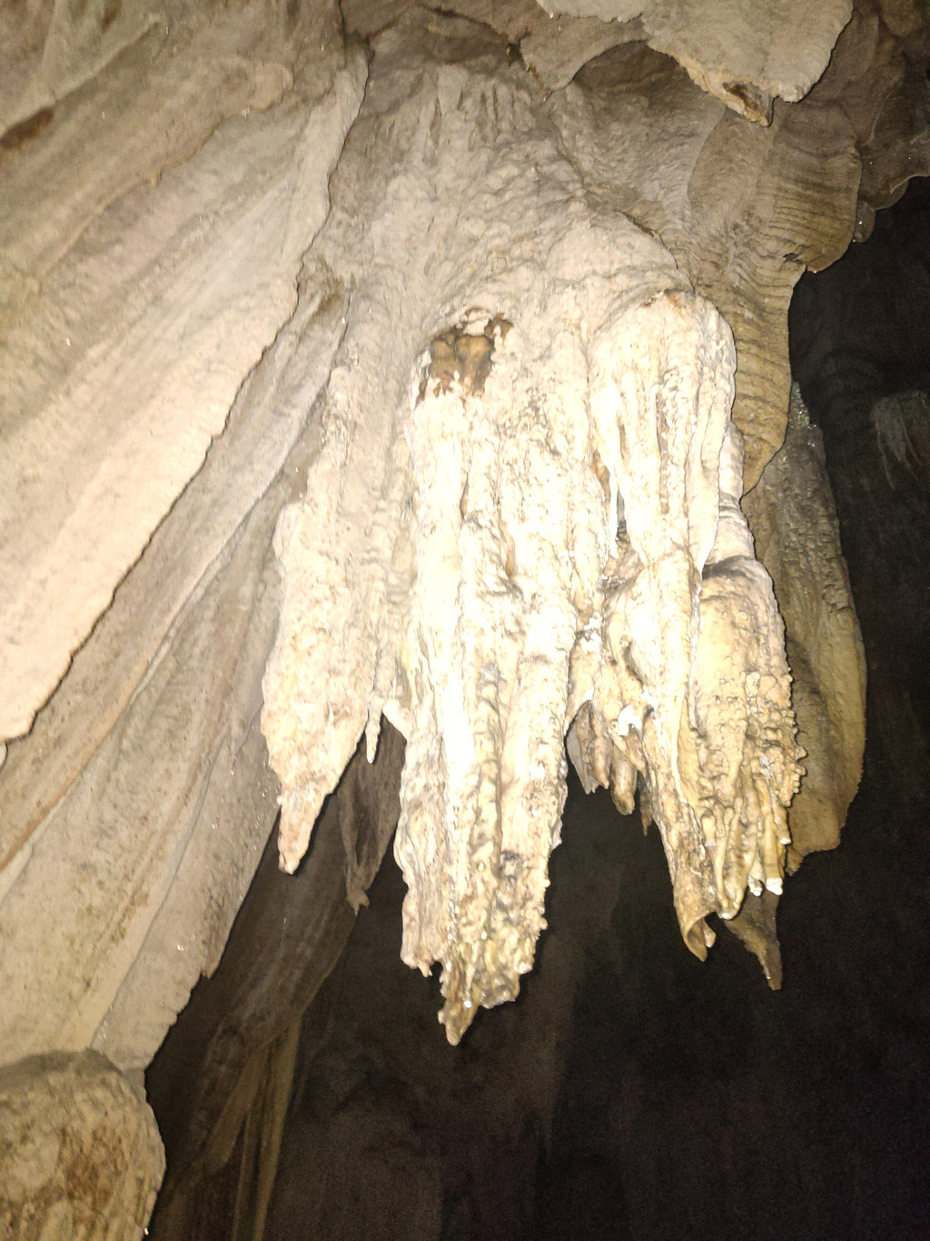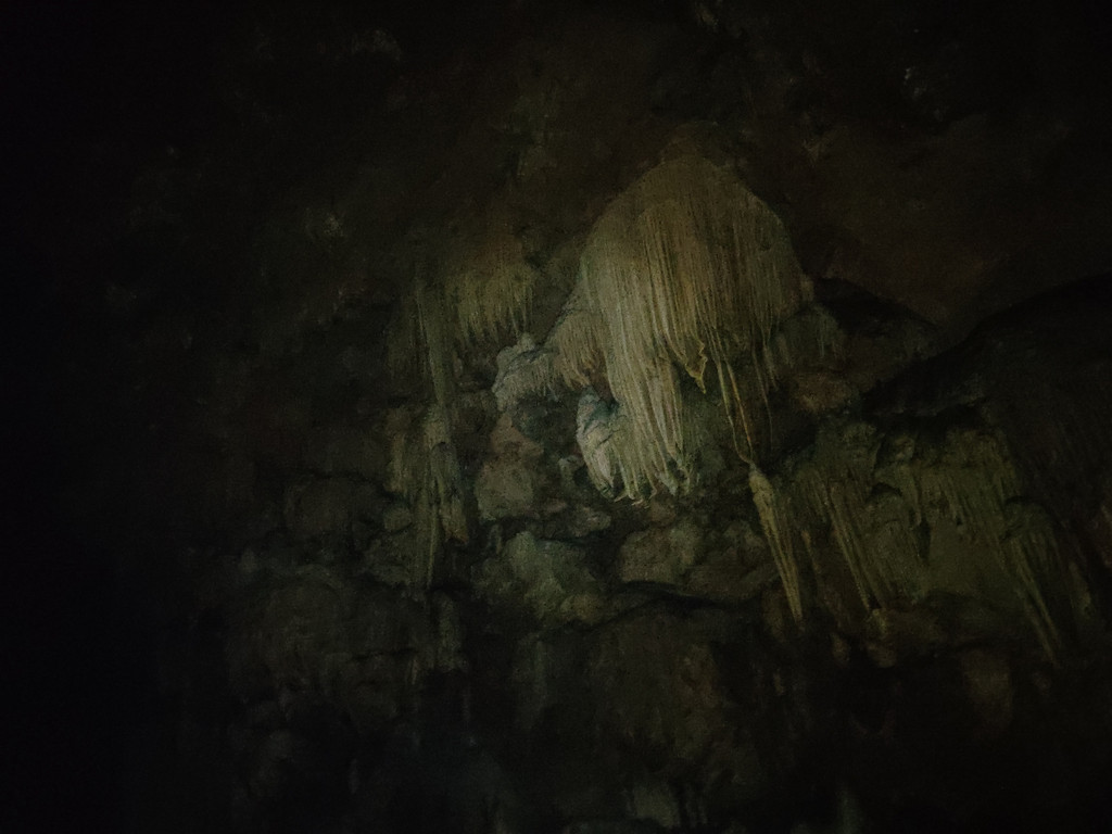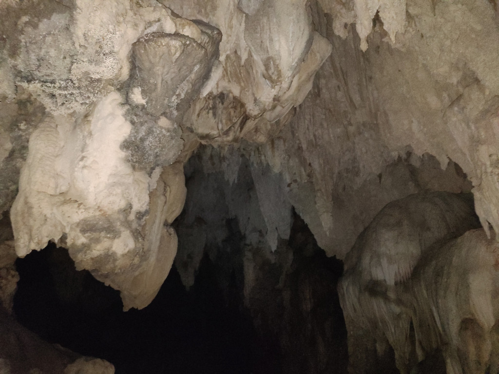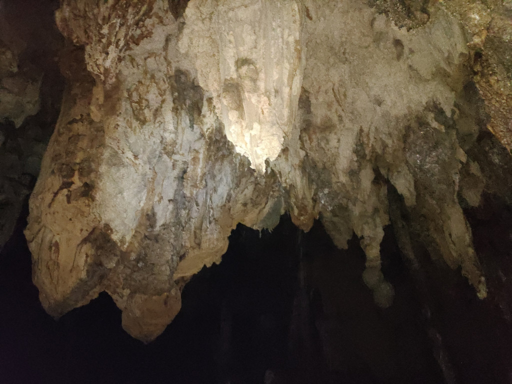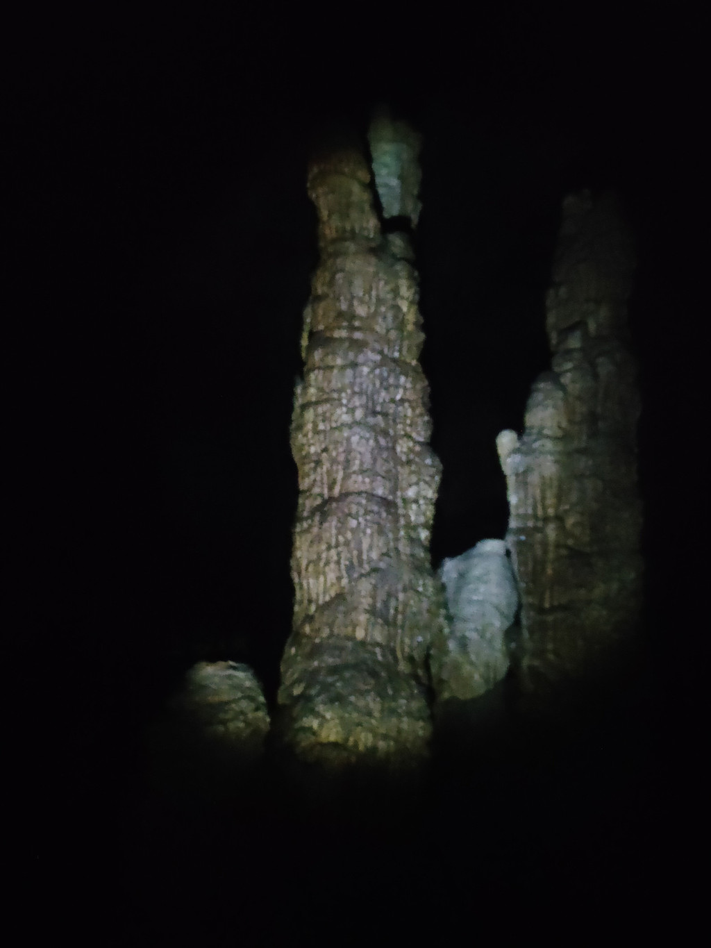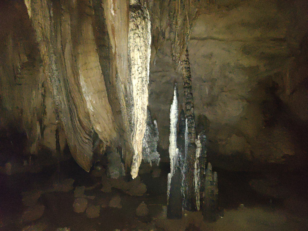 走进洞口,我们才知道为什么需要用探照灯和手电,因为里面完全没有任何灯光,全封闭的喀斯特溶洞,连天窗都没有一个,所以别想着漏一丝光线下来。