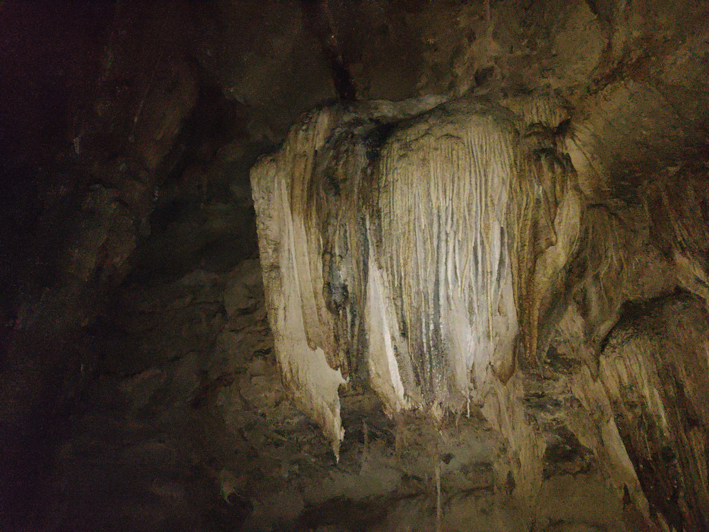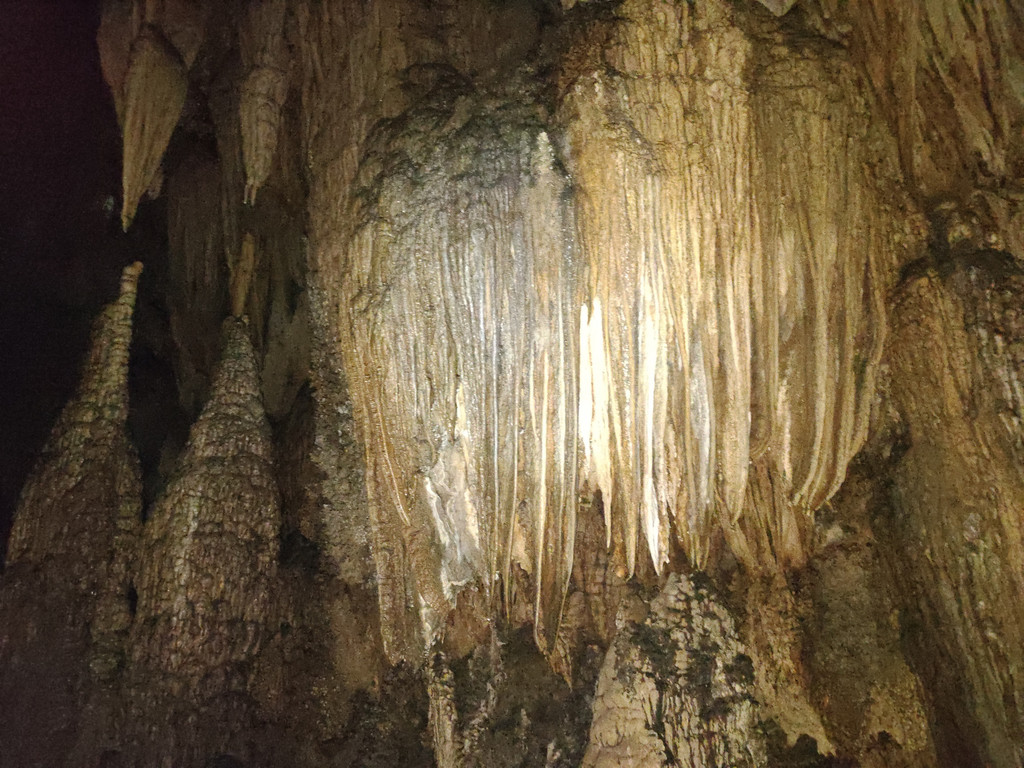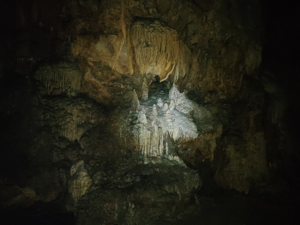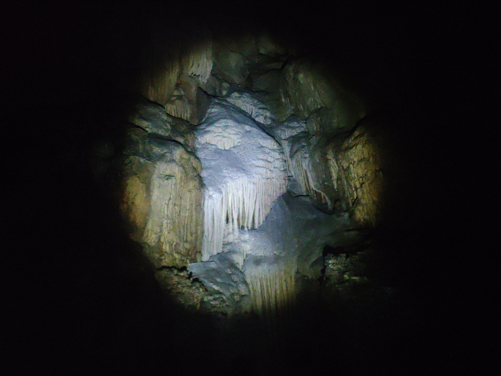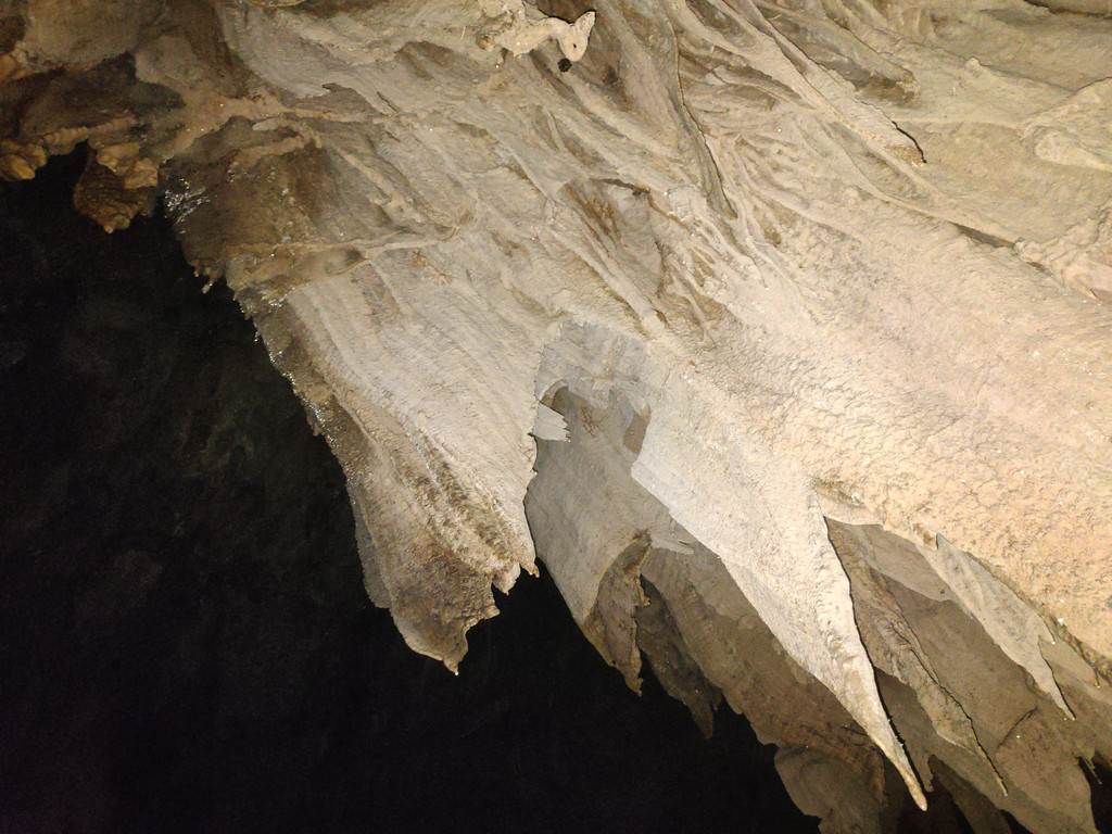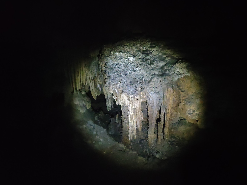走进洞口,我们才知道为什么需要用探照灯和手电,因为里面完全没有任何灯光,全封闭的喀斯特溶洞,连天窗都没有一个,所以别想着漏一丝光线下来。