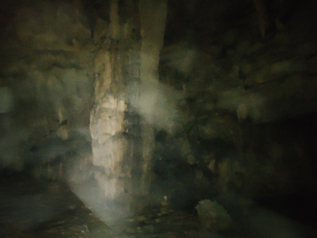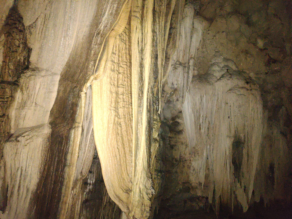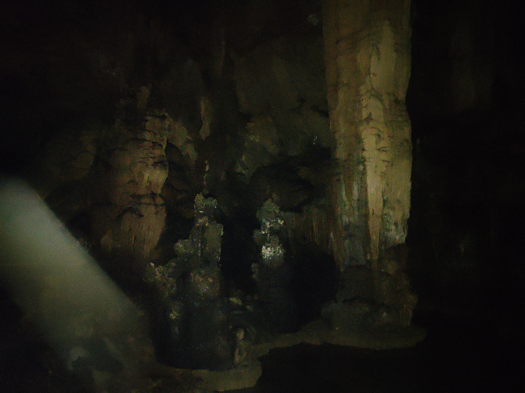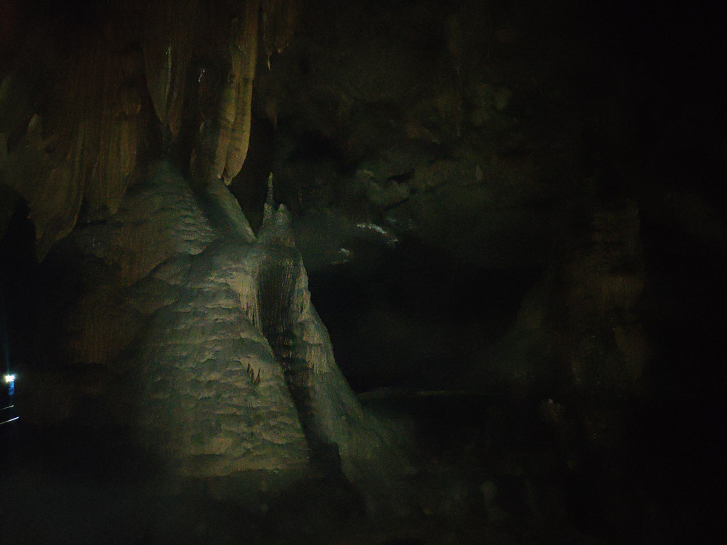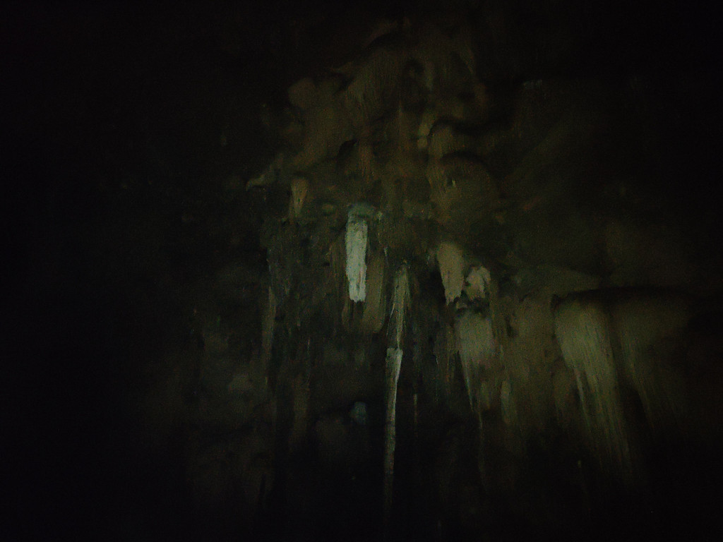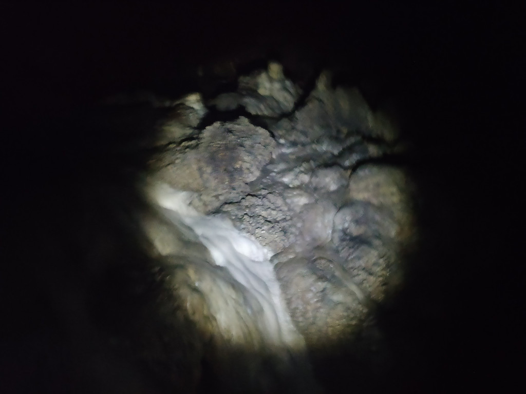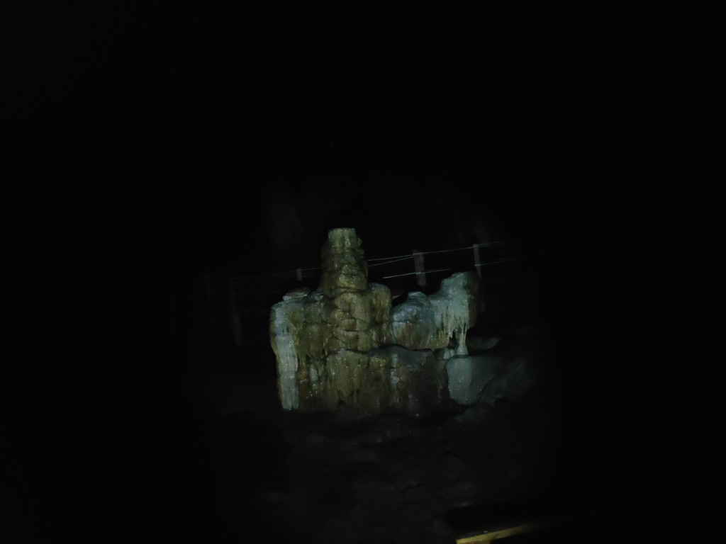 我们以前在伊岭岩的仙山也走过一个类似原生态的溶洞,不过人家好歹是装了声控灯的,走进去灯就会依次亮起,只是不像一般开发完整的溶洞那样打上五彩色的灯光而已。但这里除了洞口那一点光源以外,没有其他的光线。当我们走进去一段路后,如果熄了手电和探灯,就真的伸手不见五指。