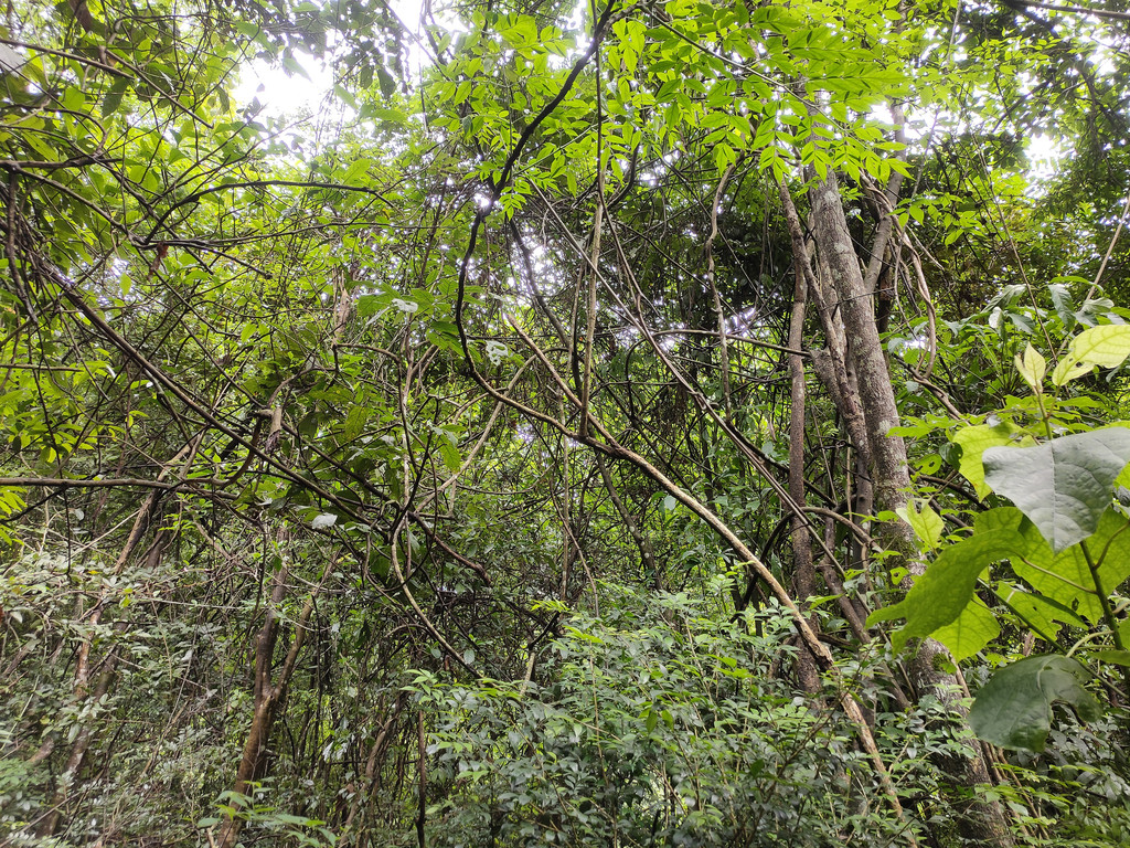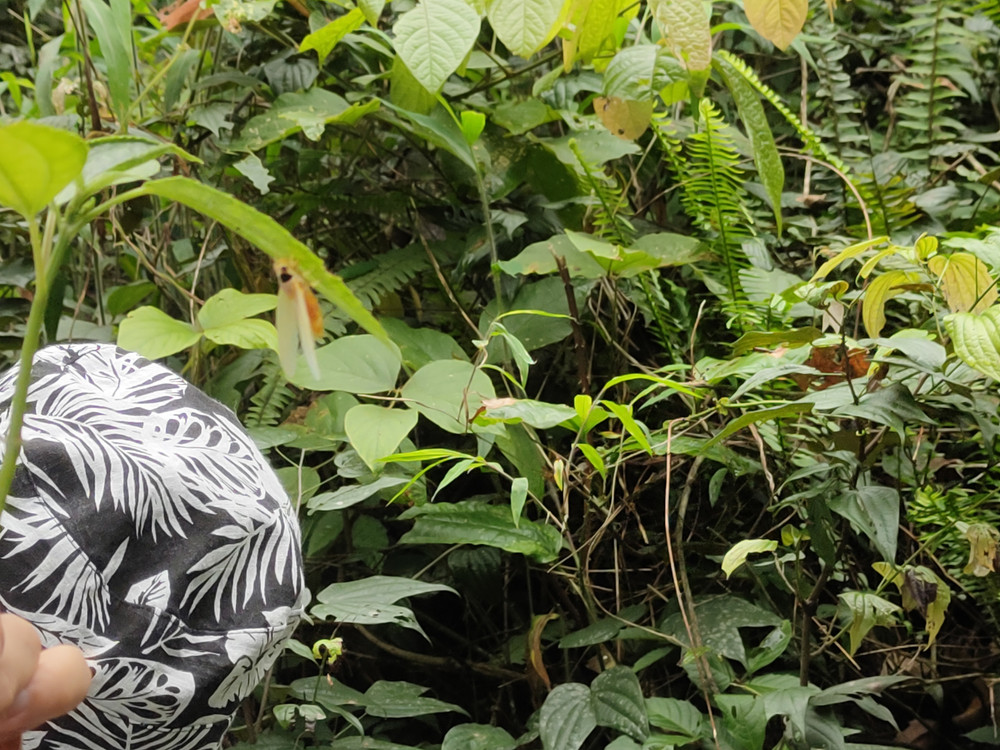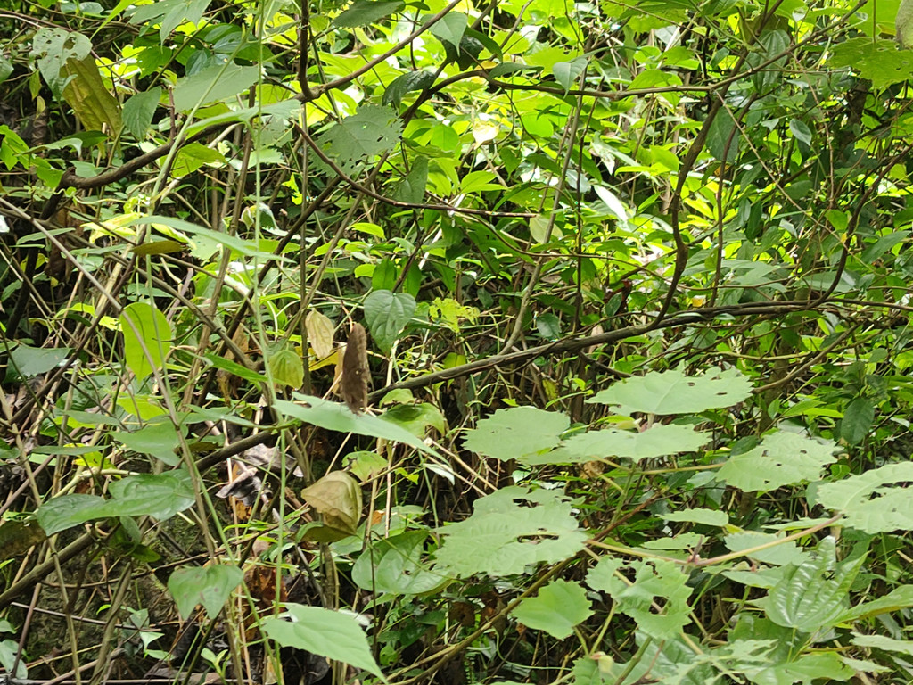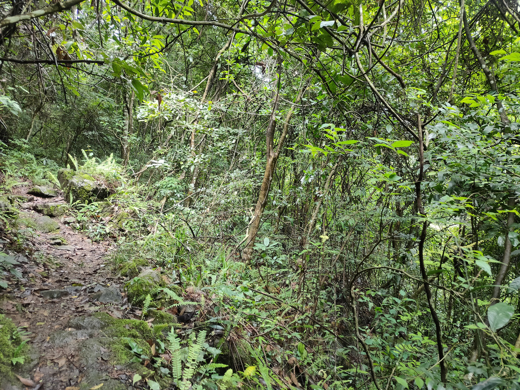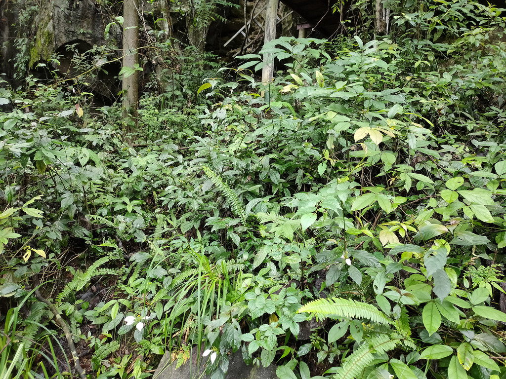 我们没有逗留太久,直接往金狮洞而去。经过一段实在不怎么像游道的道路后,终于看到了景区的牌子,沿着一段木质的栈道往上攀登。在半中间,有两条岔道,一条往漏斗森林,一条往九洞天。小伙伴对漏斗森林很向往,但我们没有请向导,但是要进入原始森林,必须一大早就出发,否则到晚上都赶不回来。我们只是走进去了一小段路,看了看茂密的树林和寄生的藤蔓,还发现了两棵兰花,但是没有花朵,也不知道是什么品种。