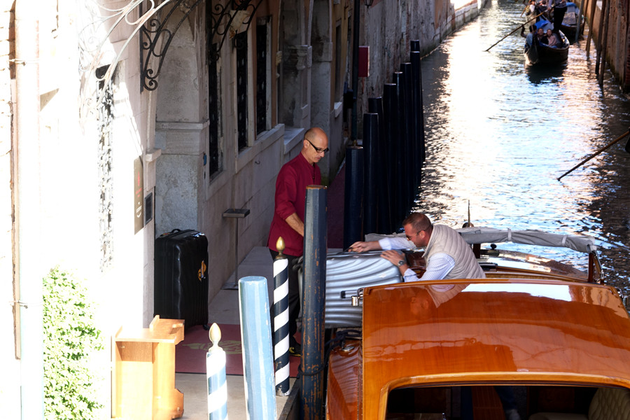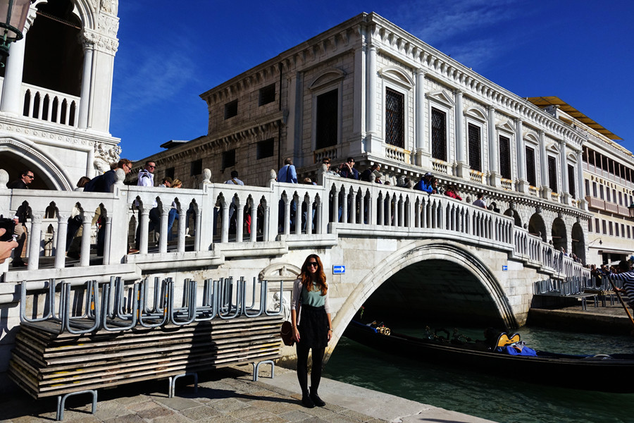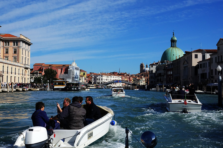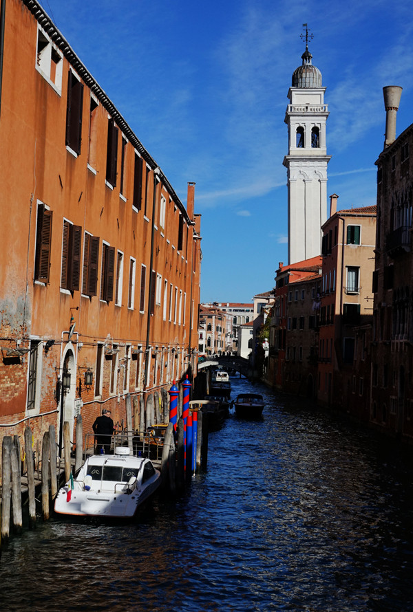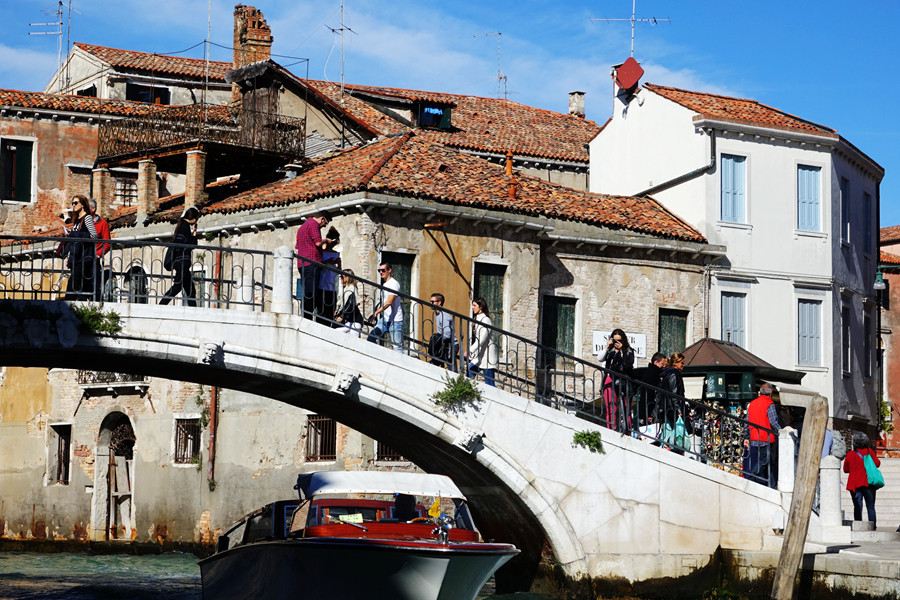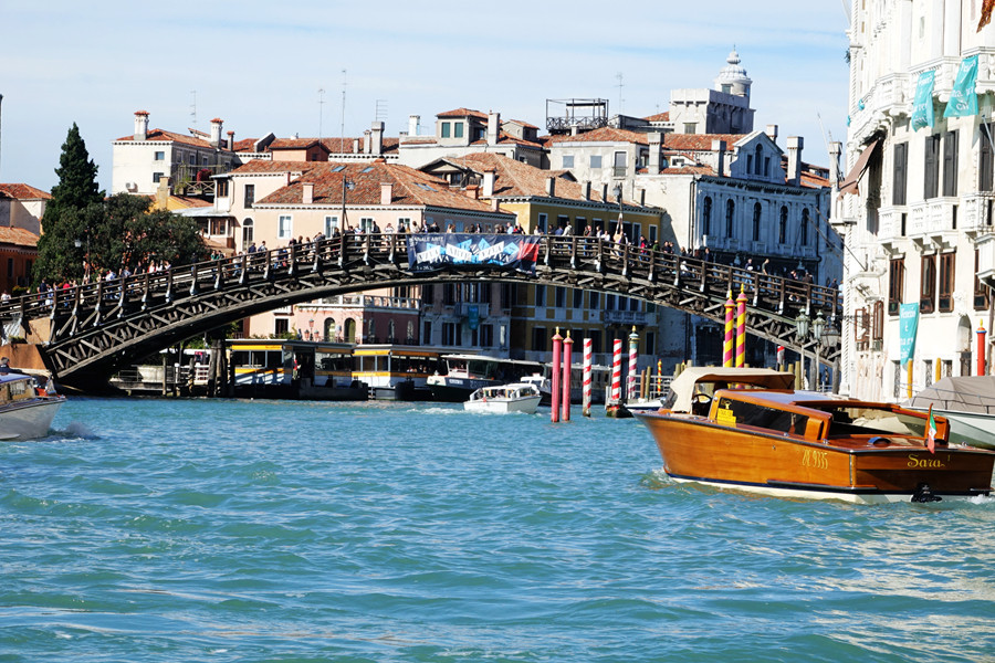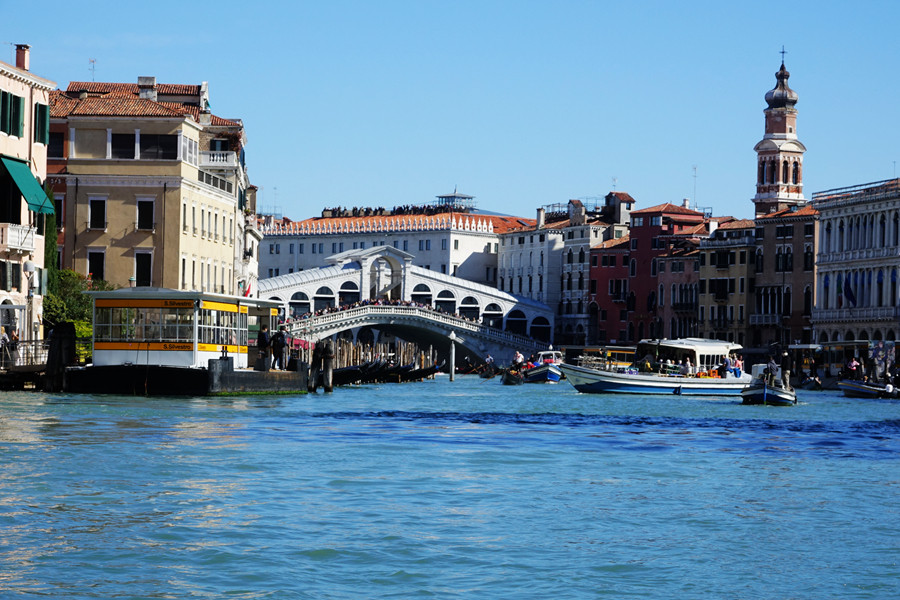每座建筑前似乎都有一个小码头,供人们上下船使用;有几个或十几个木桩,用来停泊贡多拉。运河上约450座桥,其中只有三座横跨大运河:第一座是通往研究院美术馆的研究院大桥,第二座是威尼斯运河上最著名最宏伟的里亚尔托桥(Rialto Bridge),最后一座是斯卡路茨桥。尽管我是逢桥必拍,但汽艇的速度太快,拍的桥太多,哪那座桥是那座桥还是将我弄糊涂了。