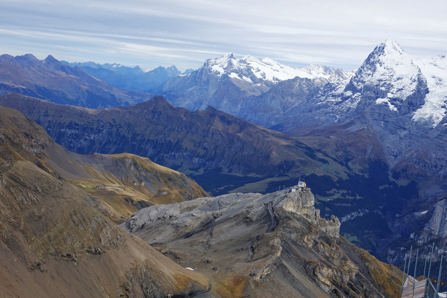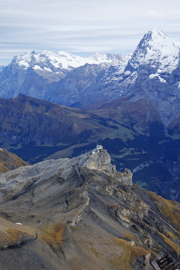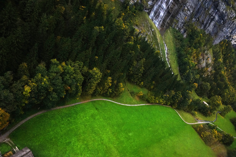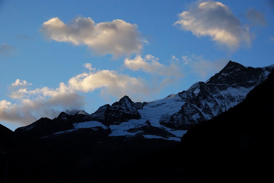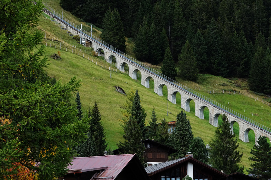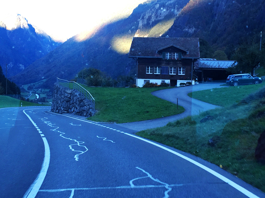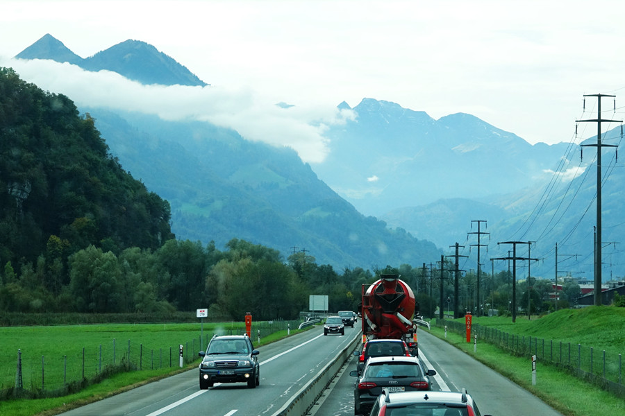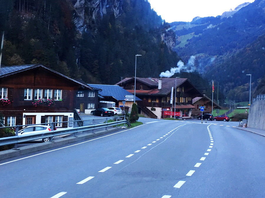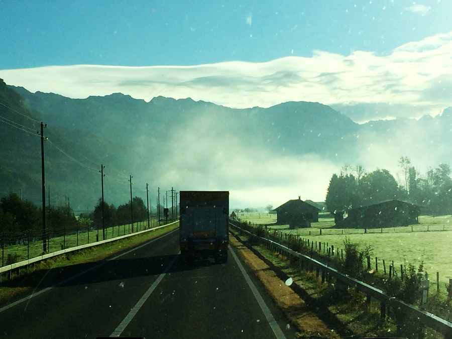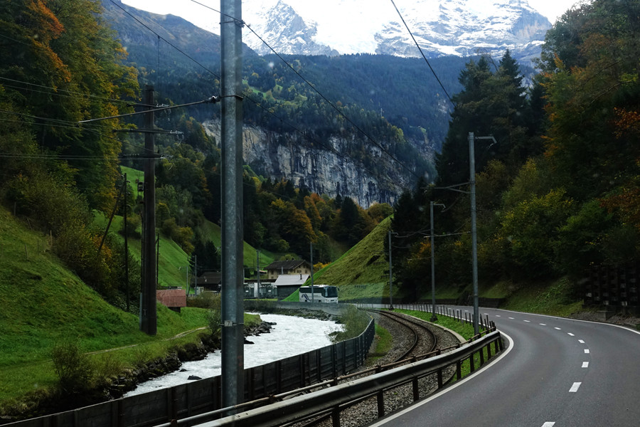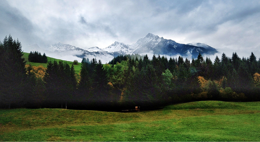 行进在群山之间,山峰之间云雾飘渺,森林雪山,天空飘着零星小雨,与瑞士的阳光明媚的田园风光形成强烈反差。
