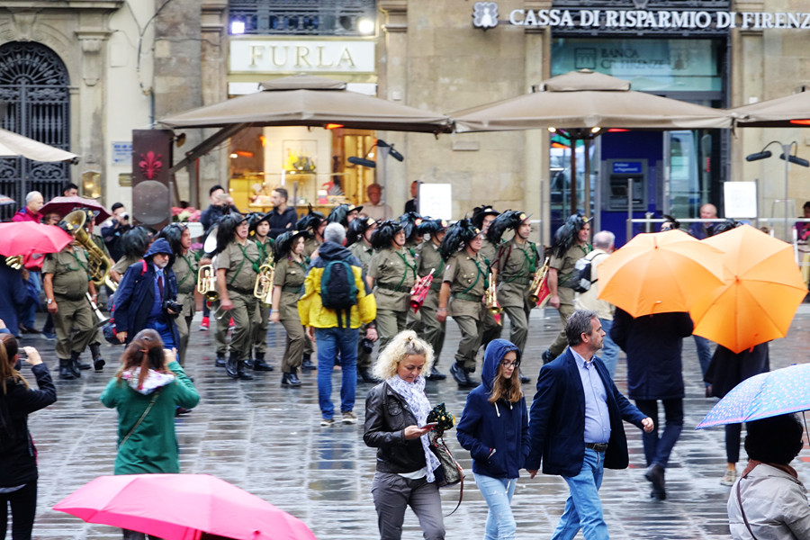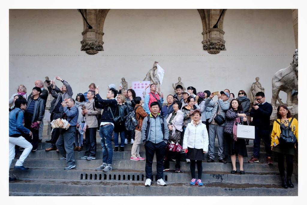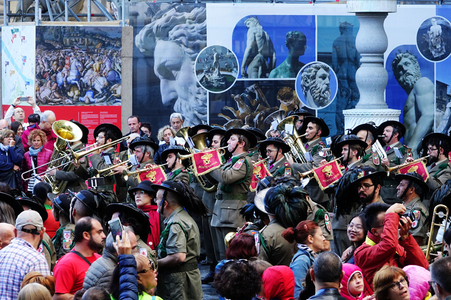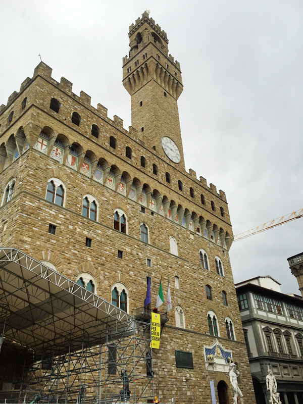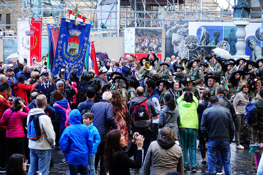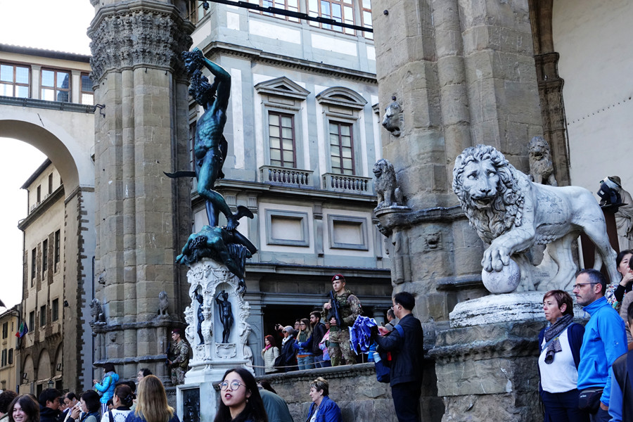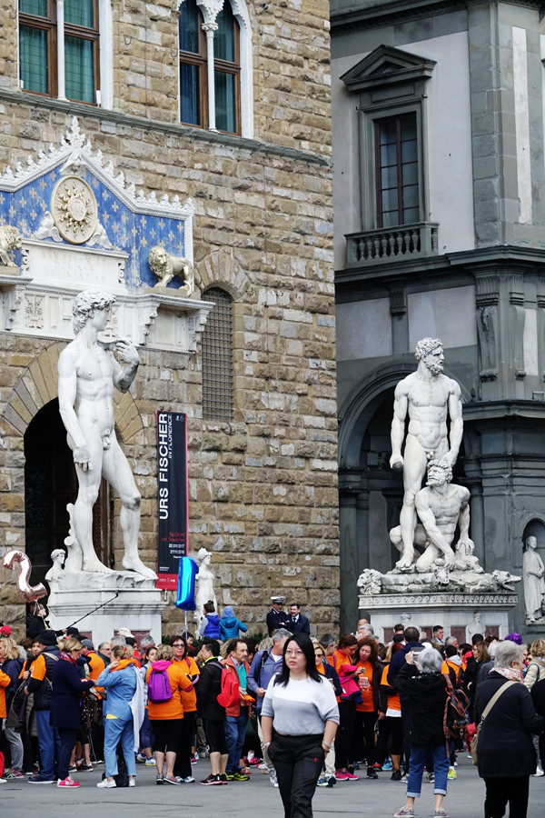 快到集合时间,我们向集合地点——领主广场走去。领主广场是佛罗伦萨的心脏,它是意大利佛罗伦萨旧宫前的“L”形广场,得名于旧宫(领主宫)。是佛罗伦萨共和国起源与历史的焦点,至今仍享有该市政治中心的名声。这里是佛罗伦萨人以及众多游客的聚会地点。我们遇上了的一场聚会。