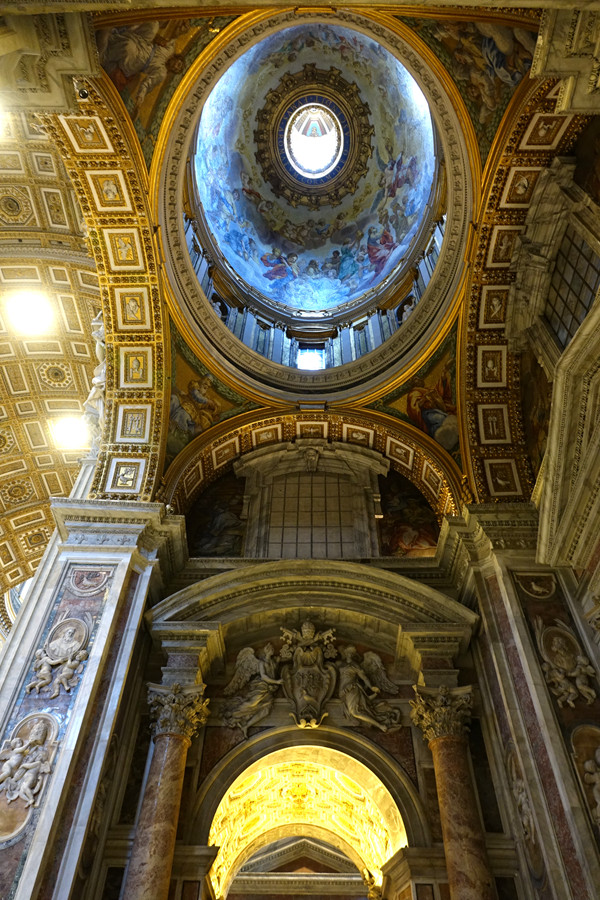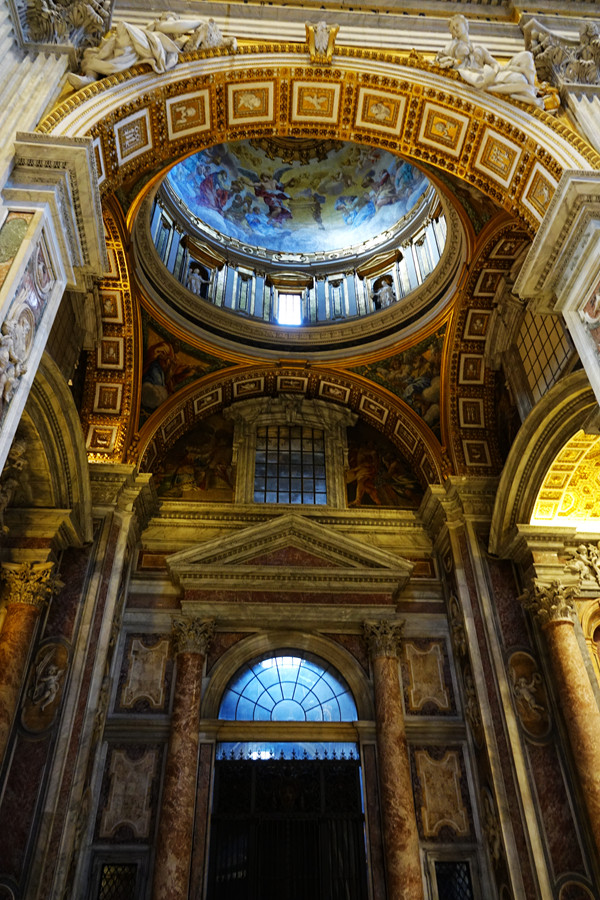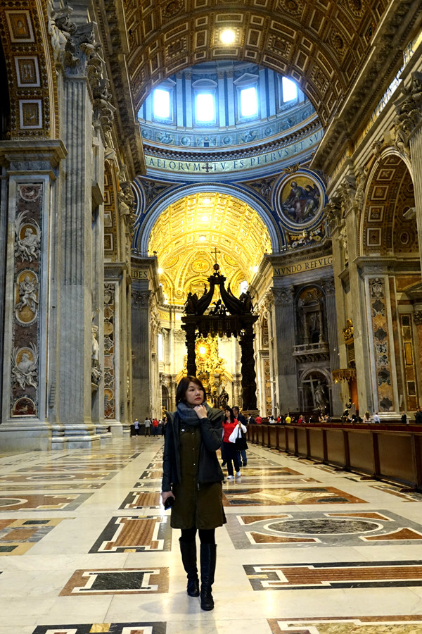 进入教堂内,殿堂之宏伟令所有的参观者惊叹,殿堂总面积15000平方米,能容纳6万人。高大的石柱和墙壁、拱形的殿顶、到处是色彩艳丽的图案、栩栩如生的塑像、精美细致的浮雕,彩色大理石铺成的地面光亮照人。上百米高的穹顶,一个套着一个,支撑起整个教堂,内部装饰精美无比,令人惊叹不已,不愧是世界第一大教堂!不少这样大型的教堂始建于11到14世纪。那个年代欧洲人就能建造上百米高的建筑,并且使用至今仍旧辉煌不减。