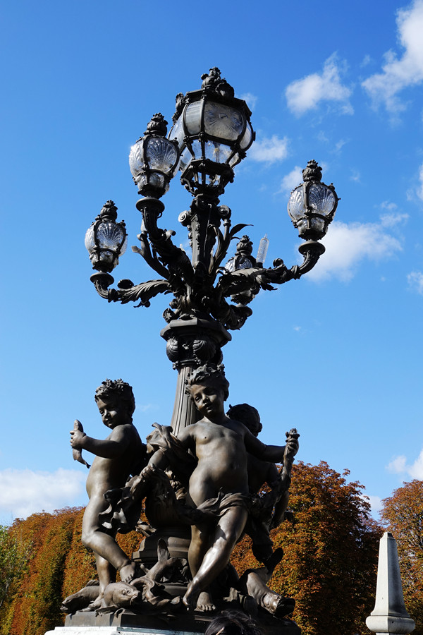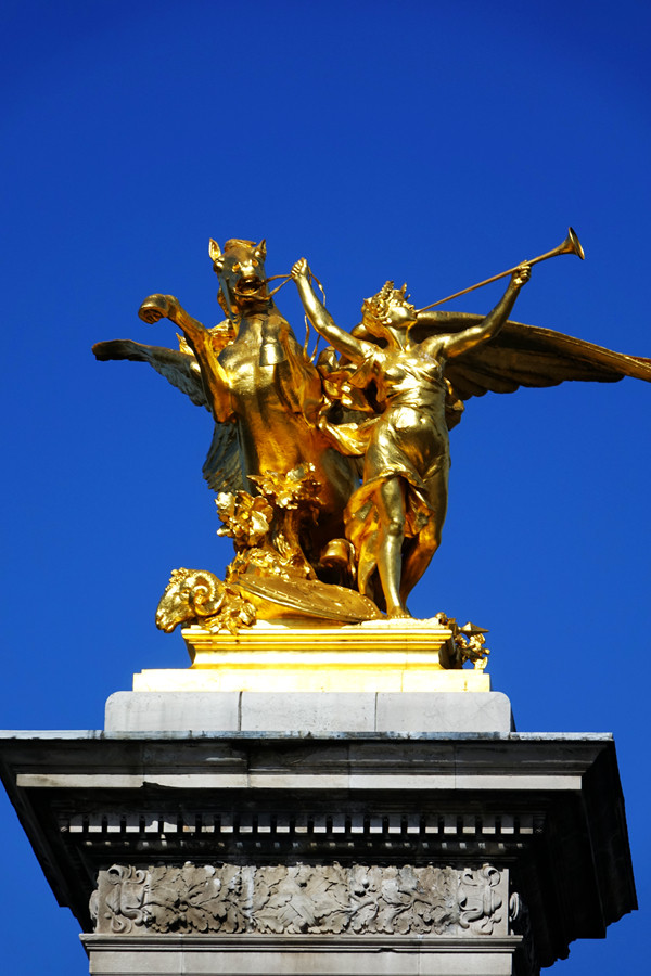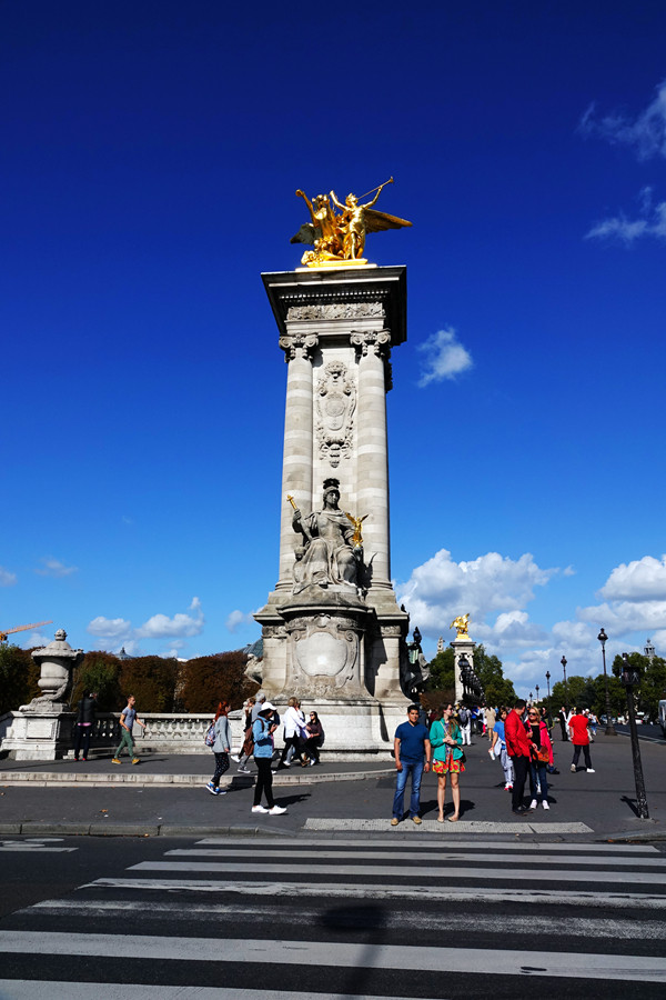 游船后,我们倘徉在亚历山大三世桥上。亚历山大三世桥是塞纳河上最漂亮最华贵的一座桥,它是由俄国沙皇尼古拉二世作为法俄亲善的礼物,捐赠给法国的,并以尼古拉二世的父亲亚历山大三世名字命名。于1896 年10 月7日奠基,1900年完工。桥身是一群水生动植物图案和一组花环图案。