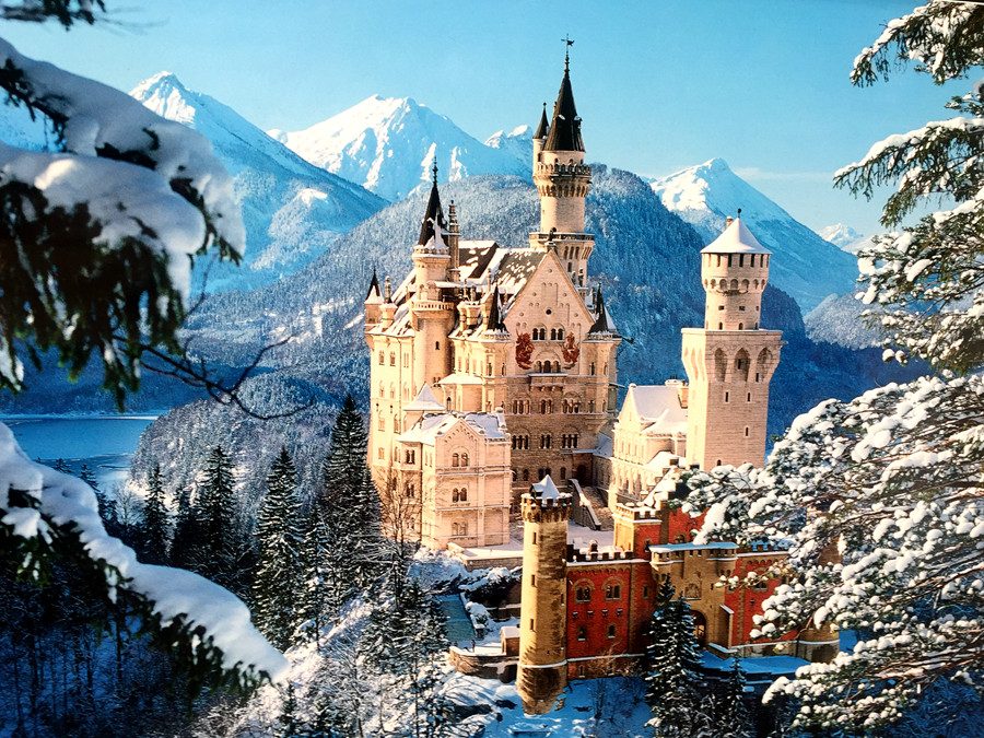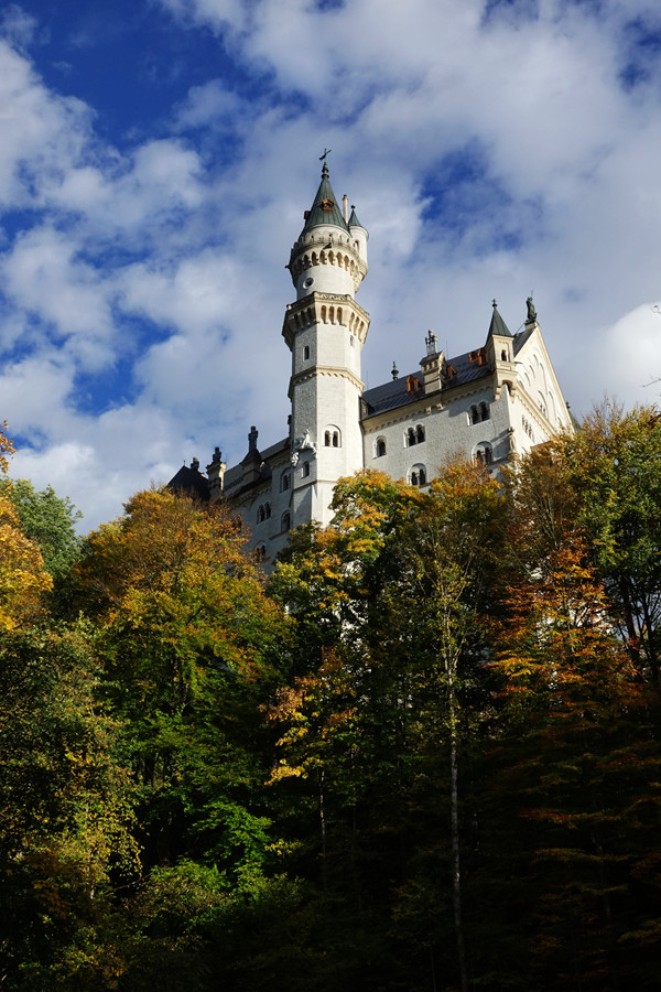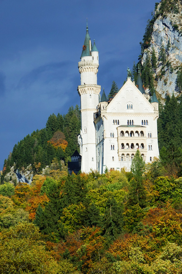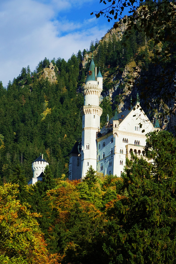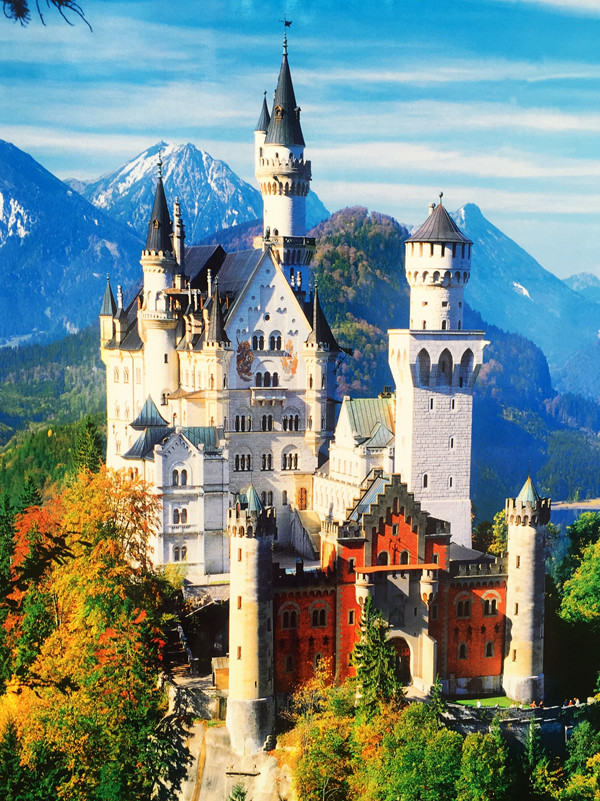 事后网搜才知道我们所见到的古堡照片,是一位专业摄影师背着装备和帐篷步行(攀爬)很久(没有开辟的道路)才到了新天鹅堡正门对面的山上一个很小的位置,并且在那里扎帐蓬慢慢拍摄的,并在一年四季不同时间同一地点同一角度拍摄。比如下面这张。就这样错过了这座梦幻古堡的拍摄,留下了深深的遗憾。