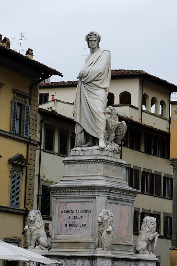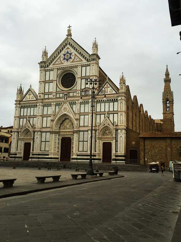 清晨阴冷的圣十字广场门可罗雀,几乎难见行人。圣十字广场是意大利佛罗伦萨主要的广场之一,形状为矩形。圣十字广场上有一座著名的十字架,这是广场、也是整个城区名字的由来。里面放着许多意大利名人的骸骨,如米开朗琪罗、伽利略和但丁都安葬于此。大门的表面重建,其它部分仍保留最初的模样,大门左侧是坦丁的雕像。我们没有进入。