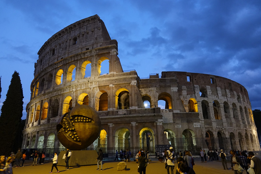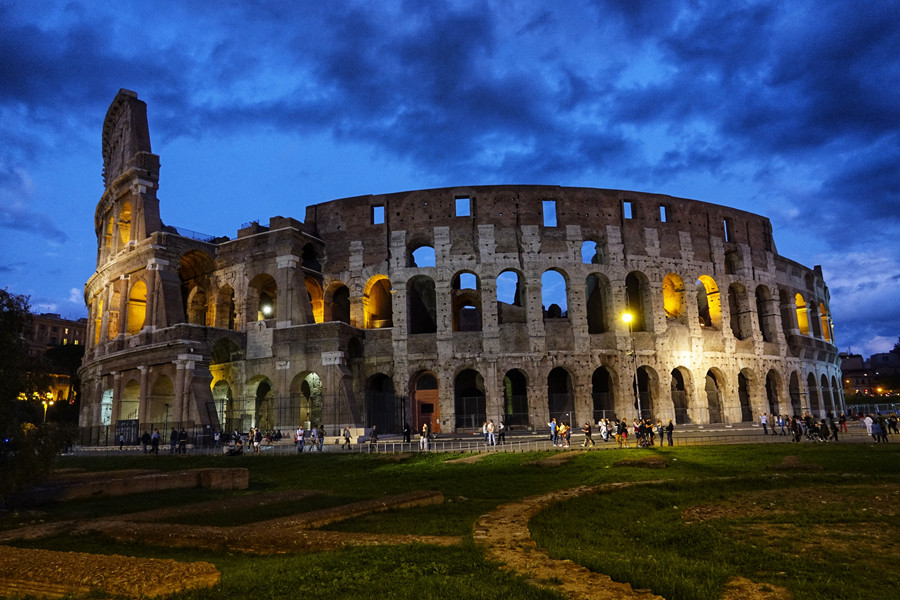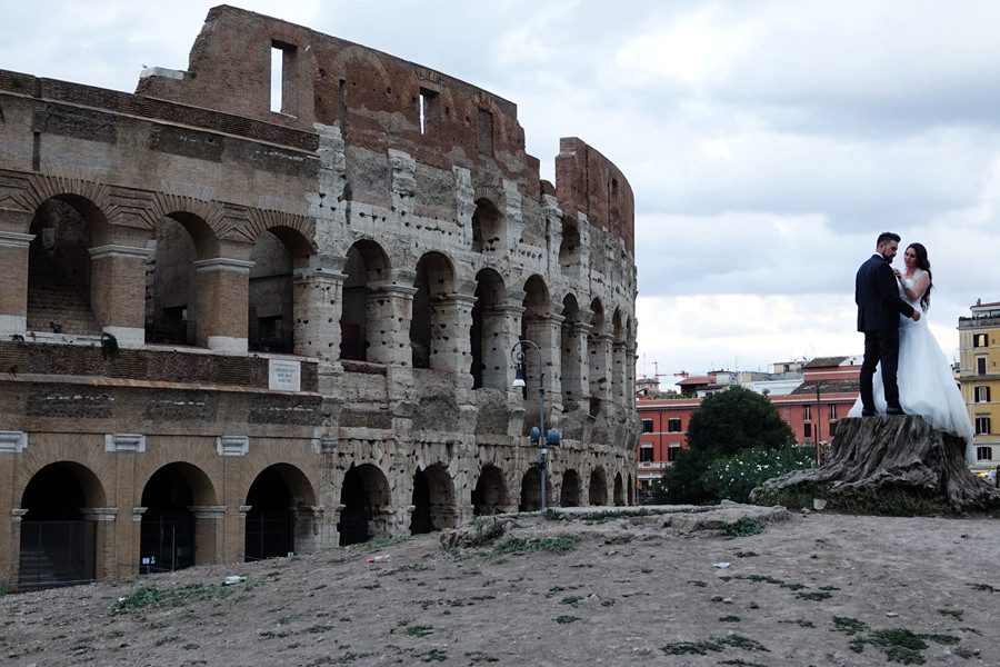 眼看着太阳慢慢落山,天色渐暗,大家都担心去到罗马斗兽场无法拍照,个个心情焦急。从圣彼得大教堂到斗兽场只需15分钟车程,但时间已过六点,早就关了大门。幸运的是,当夜幕降临时,斗兽场开启了灯光,让我们有机会捕捉到夜幕下斗兽场,令人震撼!椭圆形的建筑、斑驳的墙体,残缺的围墙…..,历史的沧桑满满地写在了这座古老的建筑上。有情侣以此为背景拍摄婚纱照,更多的是游客的流连忘返。从黄昏到夜幕降临,我们绕着这座古老的建筑走了半圈,从不同的角度拍摄下这座伟大的建筑。