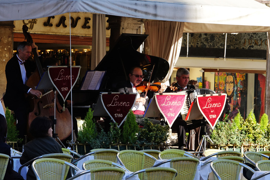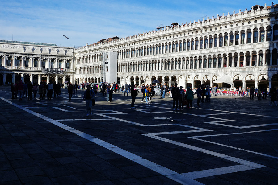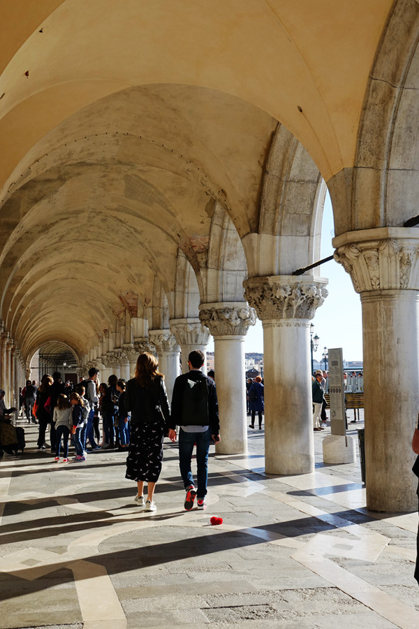 圣马克大教堂对面的广场,右侧如城墙长长的一排整齐的罗马柱建筑,将大广场围在其内,阳光下折射出立体的美感。建筑下露天的休息区,有艺人在演奏美妙的音乐,孩子们在嬉笑着追逐着广场鸽子,游人们在开心的微笑,温馨浪漫的空气弥漫在广场上空。