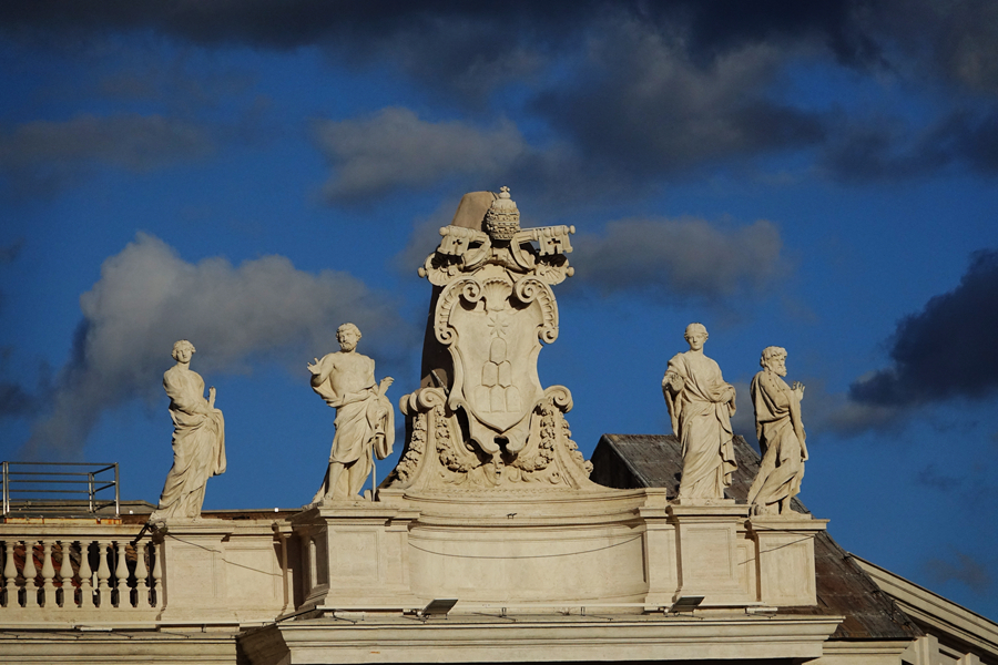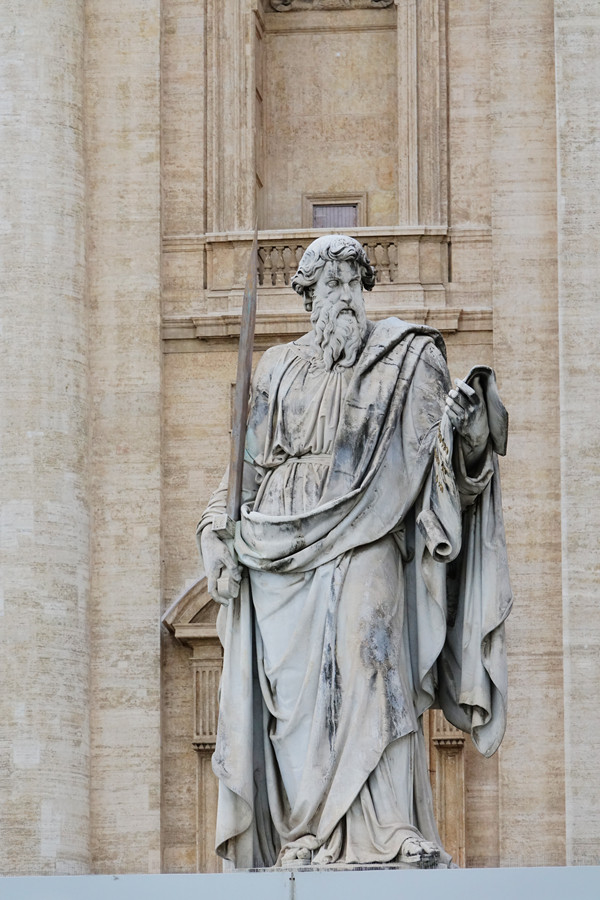 圣伯多禄大教堂门前左边树立着圣伯多禄高大的雕像,他神情自若、面带微笑,右手握着两把耶稣送给他的通向天堂的金钥匙,左手拿着一卷耶稣给他的圣旨。他头上的缕缕卷发、脸上的根根皱纹、下巴上的撮撮胡须和身上的层层长袍无一不被雕琢得细腻、逼真。