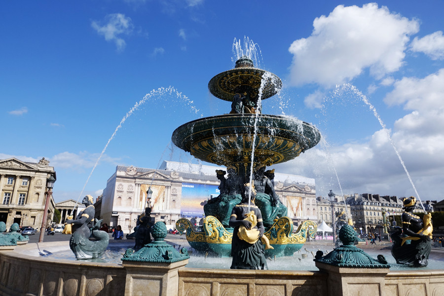 协和广场上的喷水池上有6个精美的青铜雕美人鱼,手中各抱一条鱼,从鱼嘴中喷出几米高的水柱,水花飞溅,宛若飘纱。