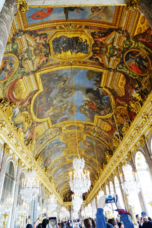 镜廊是凡尔赛宫内的一大名胜。它全长72米,宽10米,高13米,连结两个大厅。长廊的一面是17扇朝花园开的巨大的拱形窗门,另一面镶嵌着与拱形窗对称的17面镜子,这些镜子由400多块镜片组成。半球形穹顶上是精美的绘画。当天参观的人太多,难以拍到一张满意的照片!