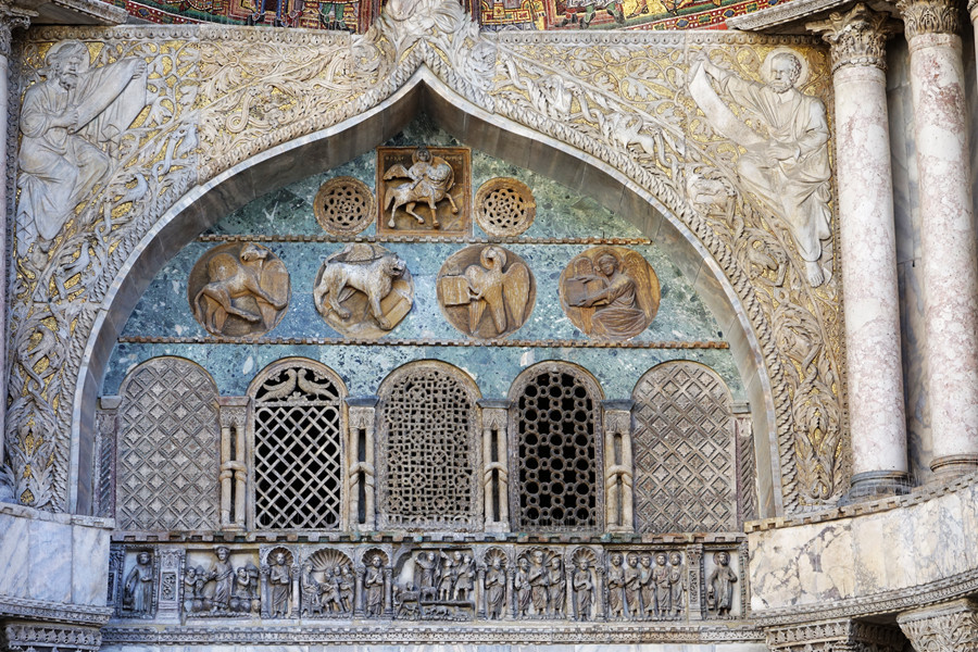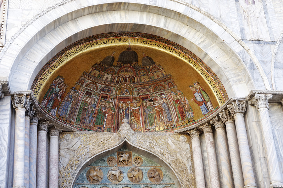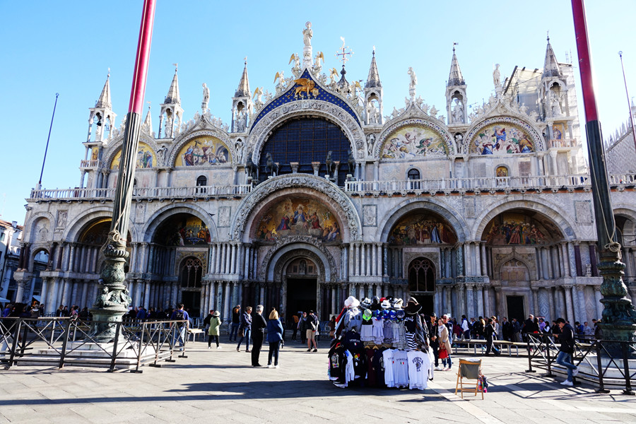 圣马可大教堂由于其中埋葬了耶稣门徒圣马可而得名。它矗立于威尼斯市中心的圣马可广场上,至今已有一千多年历史。它是威尼斯的骄傲,威尼斯的荣耀,威尼斯的富足,还有威尼斯的历史和信仰。如今,大教堂是东方拜占庭艺术、古罗马艺术、中世纪哥德式艺术和文艺复兴艺术多种艺术式样的结合体。教堂内还存有许多十字军东征所劫掠的奇珍异宝,有绿宝石、红宝石、罕见的非洲大理石、以及镶金的宗教绘画。此外还有从君士坦丁堡掠夺回来的雪花石膏艺术品。因为时间关系,我们没有走进这座建筑。