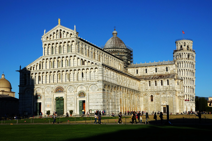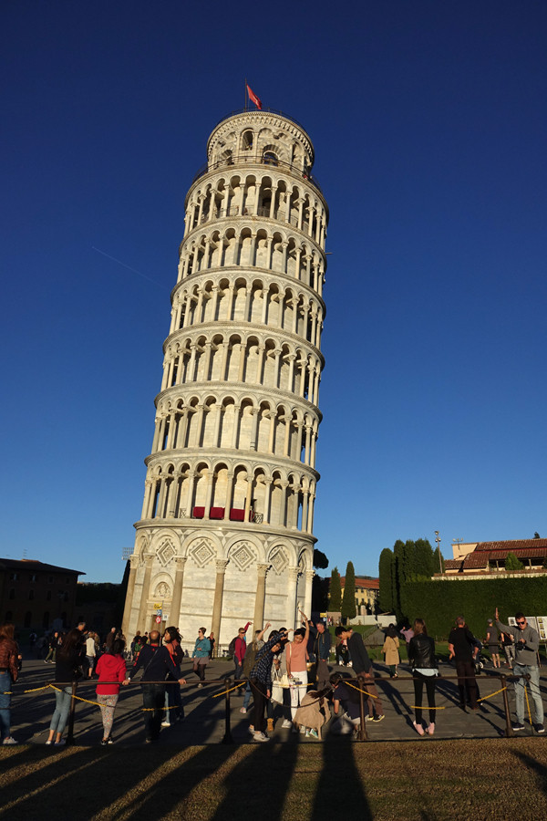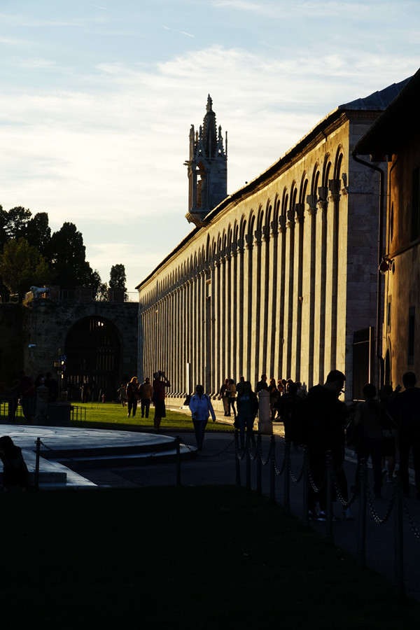 下午四点多钟来到这里,才知道这是一个建筑群,由洗礼堂、教堂和钟楼三部分组成,比萨斜塔就是钟楼。在与直立的教堂一对比,它的倾斜更显而易见。这天游人很多,看着很多的人在斜塔前做着同样的动作与斜塔合影,不禁暗自好笑。