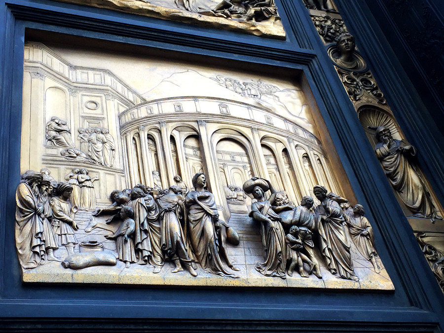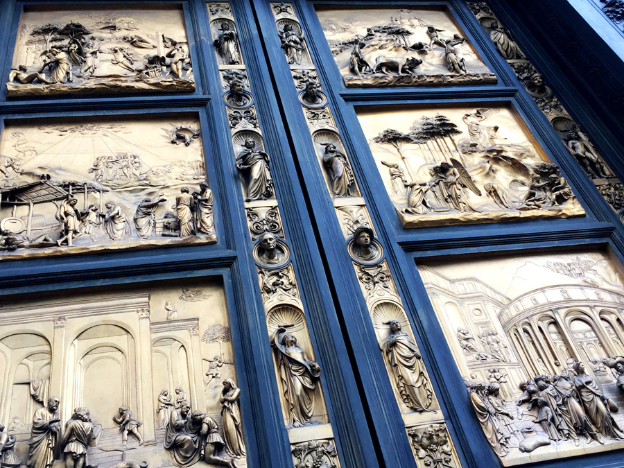 圣百花大教堂的前方,有一个被称为黄金的天堂之门,是三维黄金浮雕,由意大利雕塑家雕刻于1452年,是文艺复兴期最著名的杰作之一。大门共有两扇,每扇门上的浮雕作品都分为五块,采用圣经旧约传说中的十组故事为题材。作者用透视的手段来再现人物的位置、空间的环境和深度,近处的人物最大,远处的较小,直到最远方融入背景,造成了很强的景深感,人物栩栩如生充满立体感。