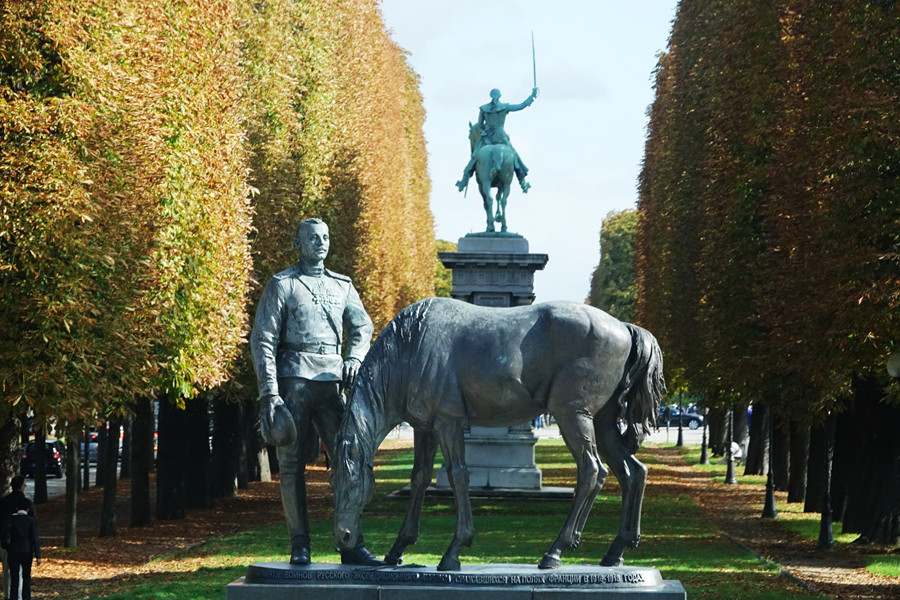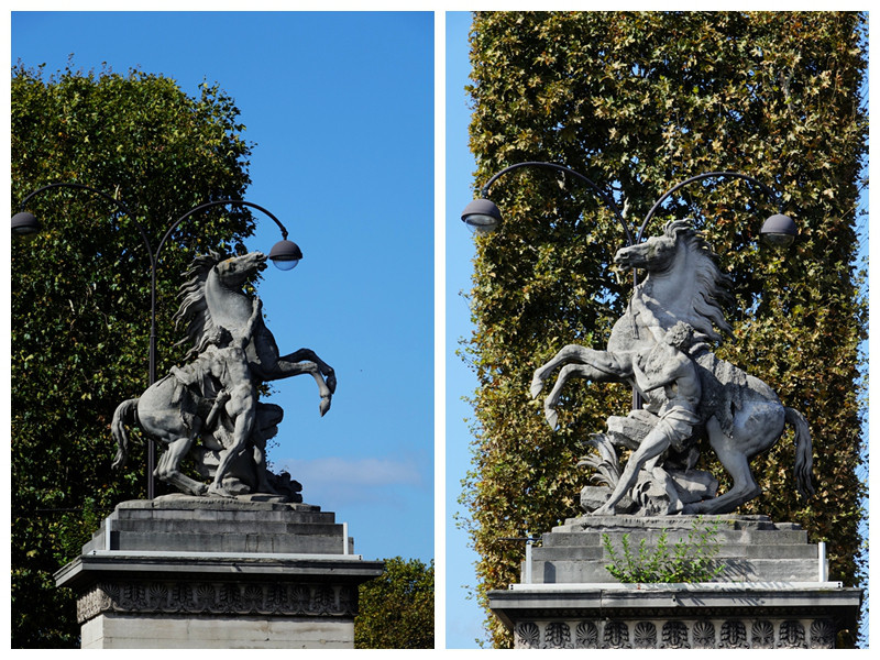 香榭丽舍田园大道入口左右两侧,矗立着由雕塑家库斯图(Coustou)最初为太阳王路易十四位于马利乐华的离宫花园所雕造的马利的骏马雕像。但这座雕像是复制品,真品则保藏在卢浮宫里。