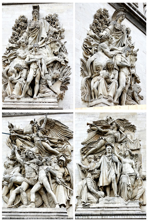 凯旋门四面各有一门,门上有许多精美的雕像,门内刻有跟随拿破仑·波拿巴远征的286名将军的名字,门上刻有1792年至1815年间的法国战事史。外墙上刻有取材于1792~1815年间法国战史的巨幅雕像。所有雕像各具特色,同门楣上花饰浮雕构成一个有机的整体,俨然是一件精美动人的艺术品。正面有四幅浮雕——《马赛曲》、《胜利》、《抵抗》、《和平》。