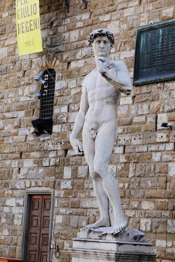 14世纪建筑旧宫及其锯齿形塔楼仍然统治着广场。广场上有许多引人注目的雕像:在广场右侧旧宫门前,有米开朗基罗大卫像的复制品,他所雕刻的大卫像被视为西方美术史上最优秀的男性人体雕像之一。大卫体格雄伟健美,神态勇敢坚强,身体、脸部和肌肉紧张而饱满,体现着外在的和内在的全部理想化的男性美。
