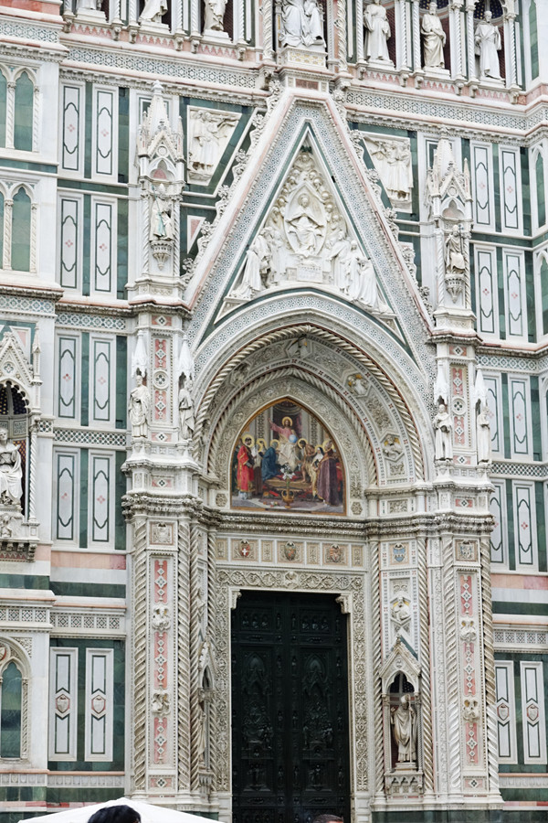 又称为花之圣母大教堂、佛罗伦萨大教堂,是世界上五大教堂之一。 用白色、粉红、绿色三种颜色的花岗岩立面,从未见过如此花俏的教堂!世上对这座教堂建筑有很高的评价:“这座使用白、红、绿三色花岗岩贴面的美丽教堂将文艺复兴时代所推崇的古典、优雅、自由诠释得淋漓尽致,被命名为“花之圣母””。这座教堂建了175年!它是如此的庞大,教堂前的广场是如此的窄小,根本就拍不完整。灰暗阴冷的天空既无法表现教堂外立面的美感,也大大限制了我拍摄的心情。