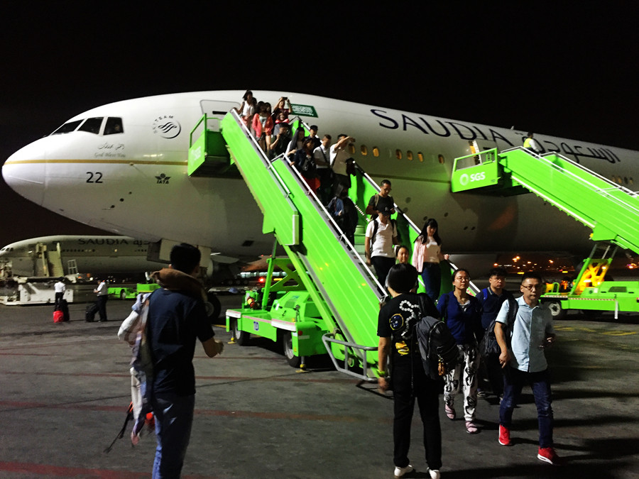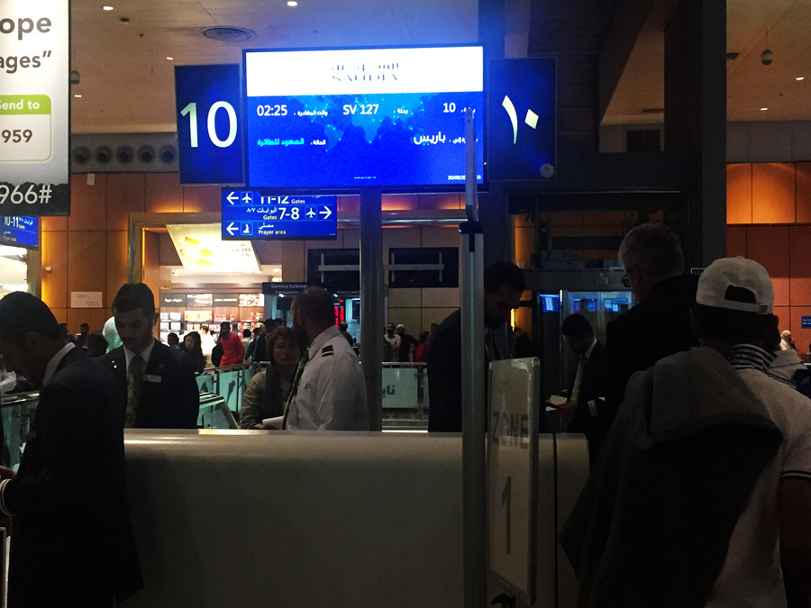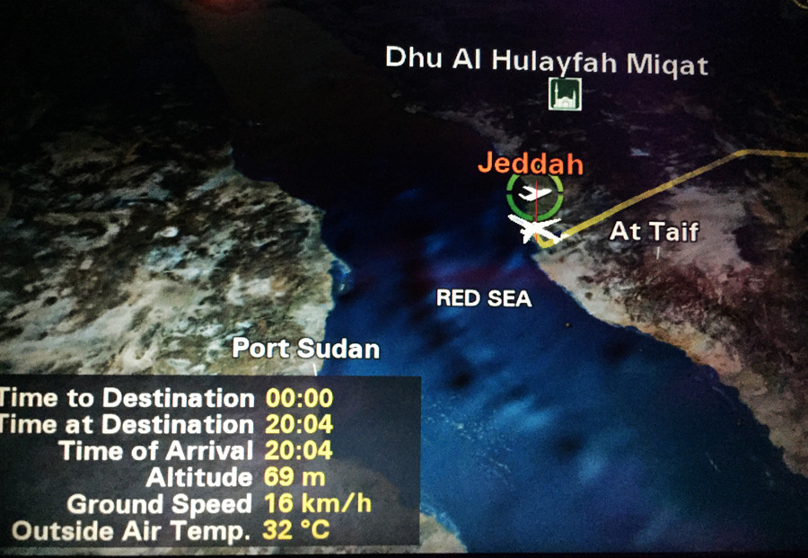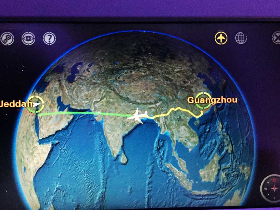 乘坐沙特阿拉伯SAUDIA航空公司15:20飞机,于北京时间凌晨一点,沙特时间20:00到达沙特的一个海滨城市吉达,飞行了将近10个小时,在吉达停留6小时后再转机飞往巴黎,又是近6小时飞行。