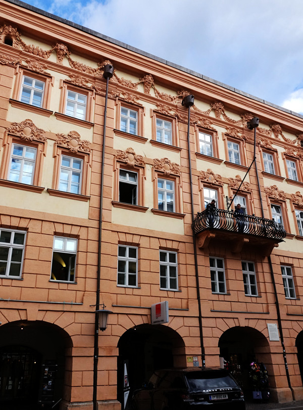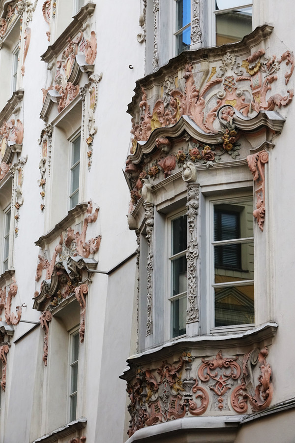 这是一个位于一个聚集了各种风格建筑的小镇。漫步小镇,有一种穿梭到中世纪城市的感觉。狭窄的小街上,文艺复兴风格的简洁建筑、仿文艺复兴建筑、巴洛克式的雕花建筑、精细雕花的洛克克式建筑、飘窗建筑的鼻祖(当初只有奥地利德国有这种风格,是为了获得更多的日照),各种建筑风格的楼房鳞次栉比,展现出古城的风貌。导游的现场讲解就好像给我们上了一堂欧洲建筑史课。