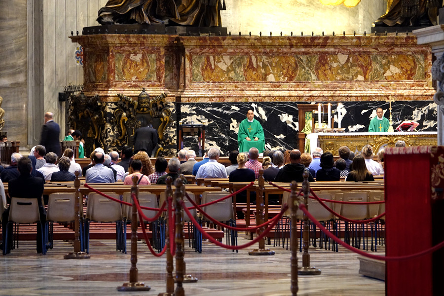 在教堂圣多禄宝座下方,信徒们正在做礼拜,两位身穿绿色长袍的牧师面对着信徒。礼拜场地被围闭起来,但允许人们进入,只要进去了就一定要坚持到结束。我们没有那个时间,只在围栏的外围感受了一下在这座世界最大教堂里做礼拜的气氛——庄重而神秘。