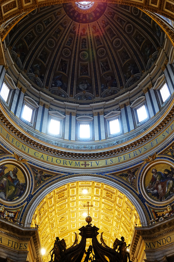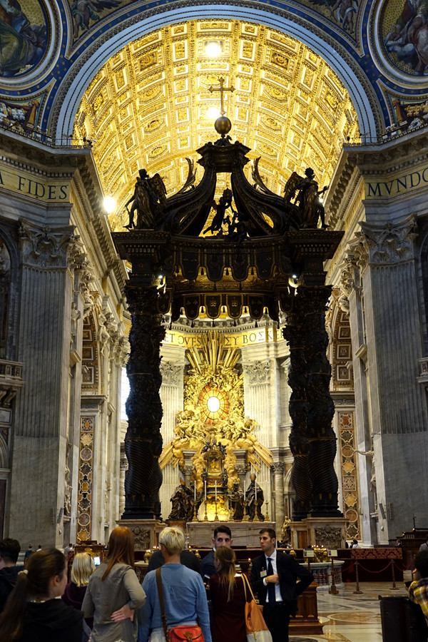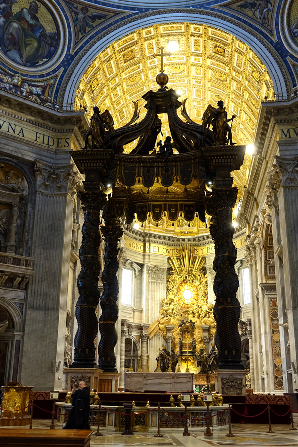 二是贝尔尼尼的雕制的青铜华盖。它由4根螺旋形铜柱支撑,足有5层楼房高那么高。华盖前面的半圆形栏杆上永远点燃著99盏长明灯,而下方则是宗座祭坛和圣伯多禄的坟墓,只有教皇才可以在这座祭坛上,面对东升的旭日,当著朝圣者举行弥撒;