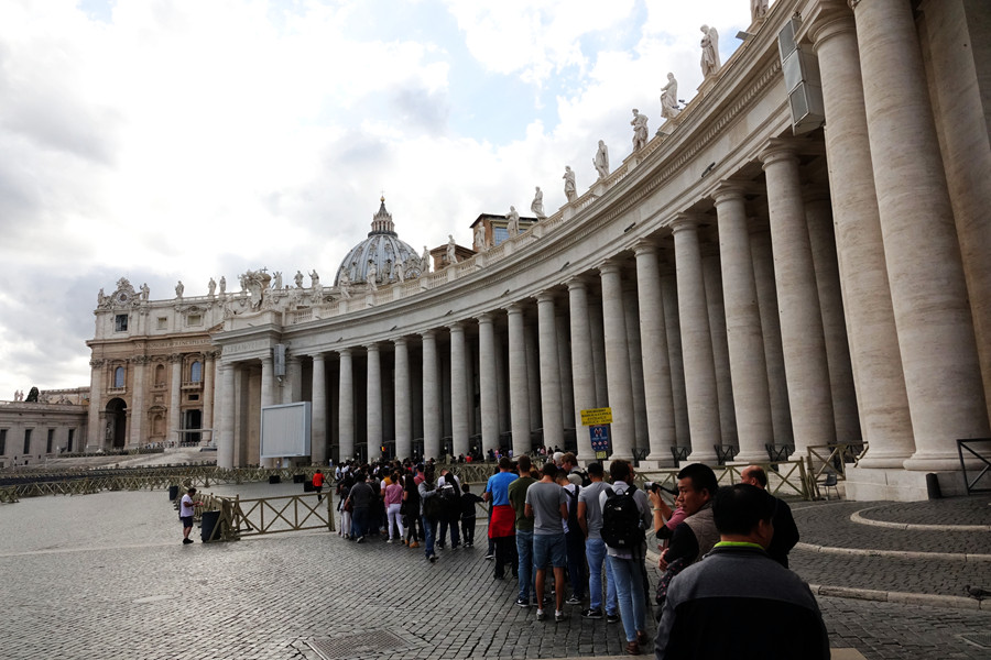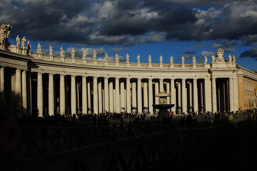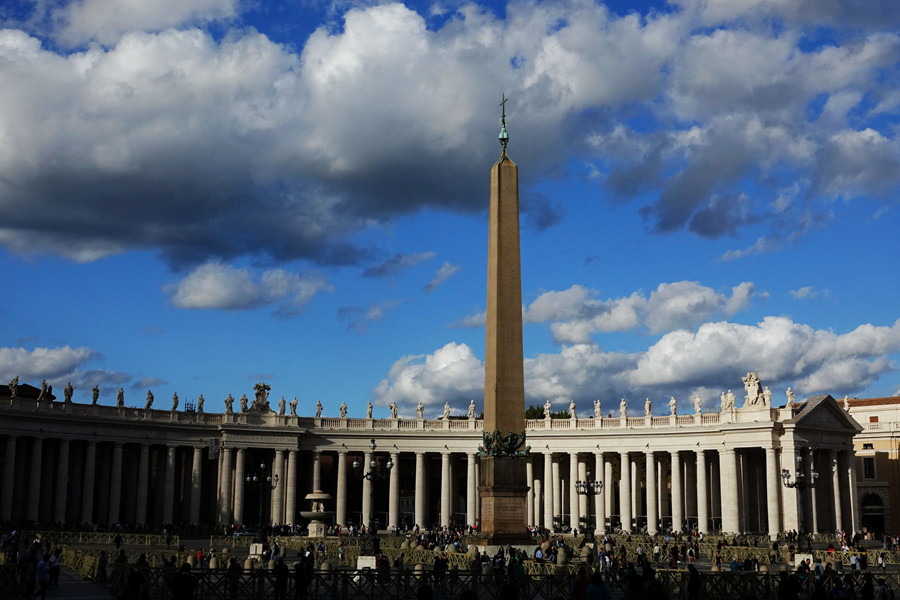 圣彼得大教堂前是一个能容纳30万人的圣伯多禄广场,被两个半圆形的长廊环绕,长廊由一个个高耸的巨大罗马柱支撑,长廊顶上有142个教会史上有名的圣男圣女雕像,一个个栩栩如生。广场中央矗立着一个埃及方尖碑,直插云霄,宏伟气派!