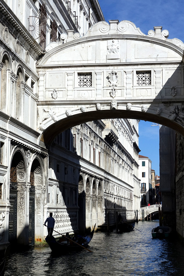 据说威尼斯有450座桥,但我唯一能记住的就是叹息桥。叹息桥是威尼斯一个著名景点,建于1603年。桥横跨两座楼,呈房屋状,为了避免路人观看,桥被封闭的严严实实,只有向运河的一侧开着两个小窗。过去,左侧是总督府,右侧是监狱,重罪犯在总督府接受审判后,就要被押送去监狱,永不见天日。经过桥的时候可以再看一眼外面的世界,犯人不禁发出一声叹息,桥以此得名。