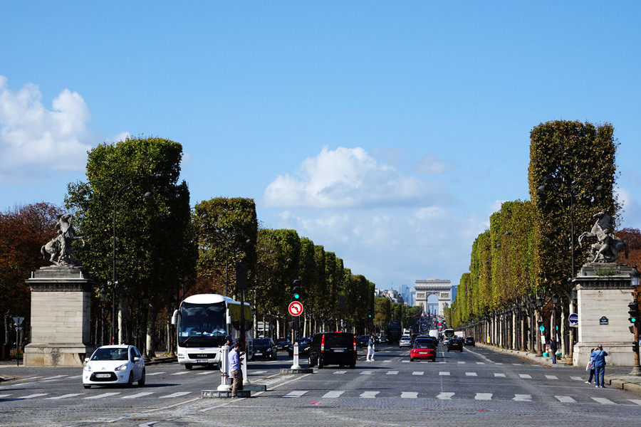 站在广场的中心放眼宽广的香榭丽舍田园大道,可以一眼望到路尽头的凯旋门。